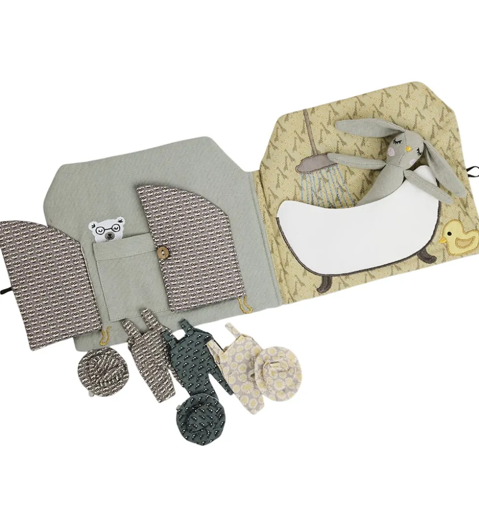Smallstuff stofbogen åbnes og en fin kaninbamse titter frem og kan leges med i det lille rum, som har klædeskab og badekar, der kan henholdsvis åbnes og puttes i. Derudover medfølger 3 outfits til kaninbamsen.