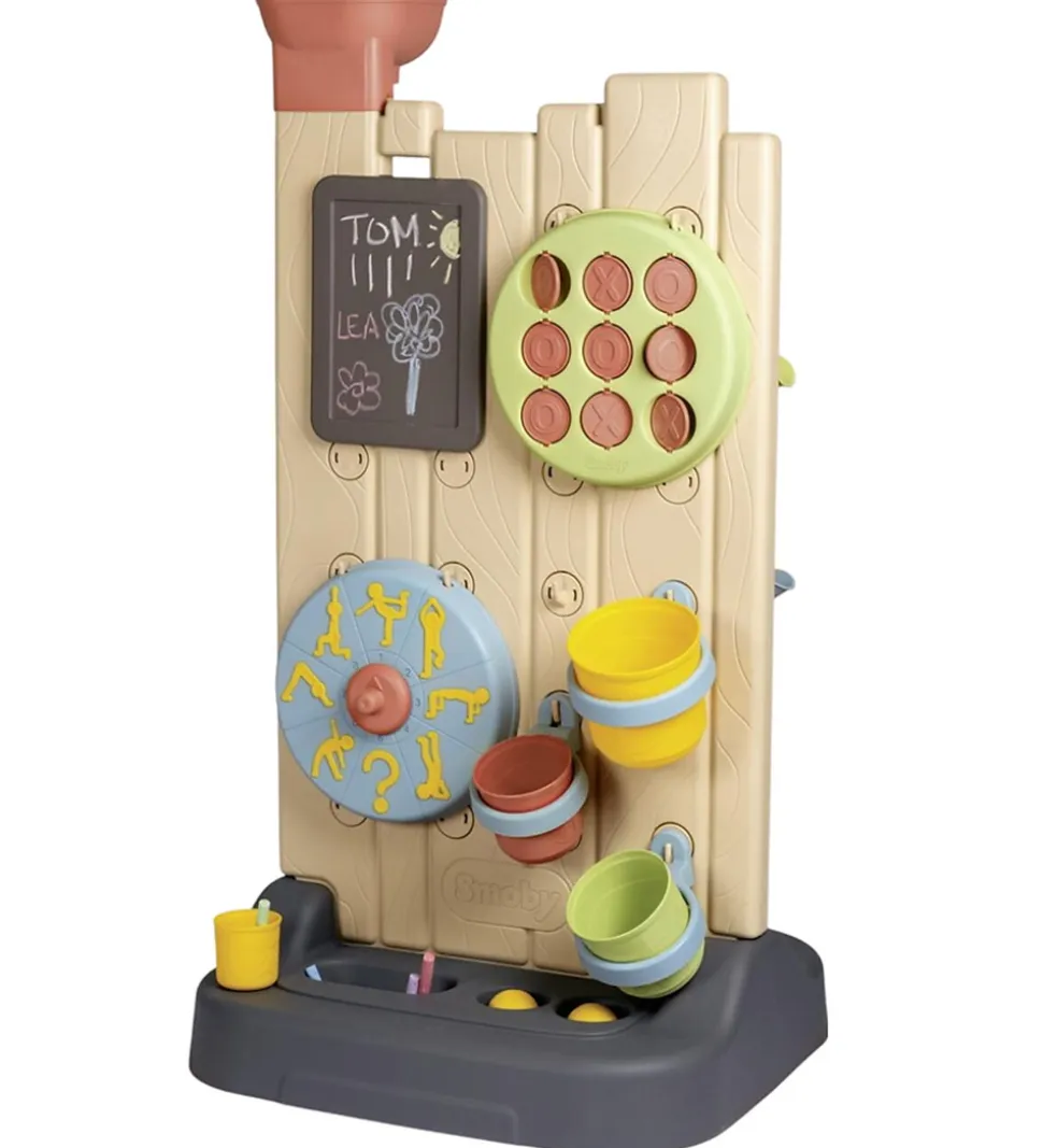 Spændende Smoby aktivitetsvæg bestående af to sider med i alt seks sjove aktiviteter. Aktiviteterne består af en tavle, kryds og bolle, et hjul med forskellige øvelser, spande til bolde, en bane til vand og en bane til bolde. Aktivitetsvæggen kan bruges på mange forskellige måder, og bygges om igen og igen, så legen kan fortsætte i timevis.