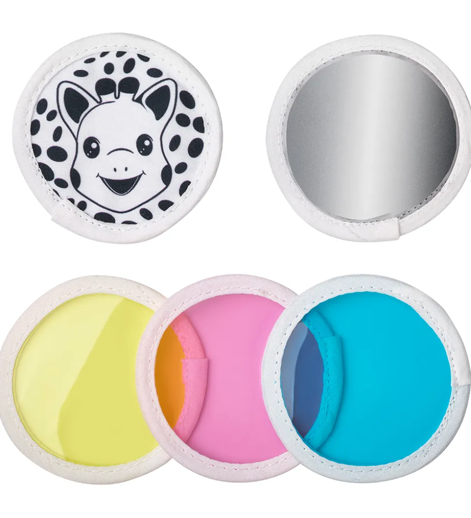 Sophie la Girafe aktivitetslegetøjet består af et spejl og 3 gennemsigtige linser i forskellige farver der kan skiftes ud i den søde girafholder. Barnet kan både bruge aktivitetslegetøj til at lege med i mange timer samt udvikle deres fin motorik og nysgerrighed