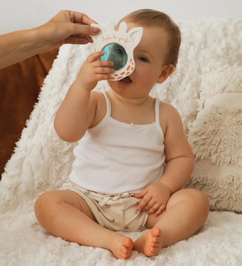 Sjovt Sophie la Girafe aktivitetslegetøj i form af et spejl formet som et giraf hoved.
