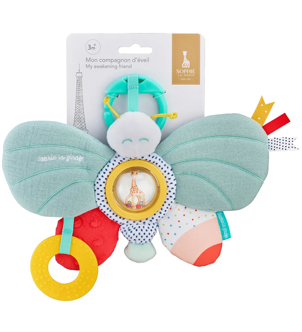 Sophie la Girafe aktivitetslegetøjet er lavet i en blød kvalitet. Der hænger en bidering fra den ene vinge, og en roterbar kugle med raslekugler og en giraf indeni. Barnet kan både bruge aktivitetslegetøj til at lege med i mange timer samt sove på ved at vende puden om, så den bløde side vender op.