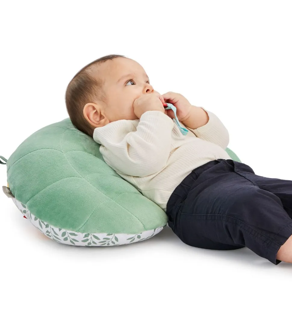 Sjovt Sophie la Girafe aktivitetslegetøj der er formet som en pude i grønne, hvide, gule og røde nuancer.
