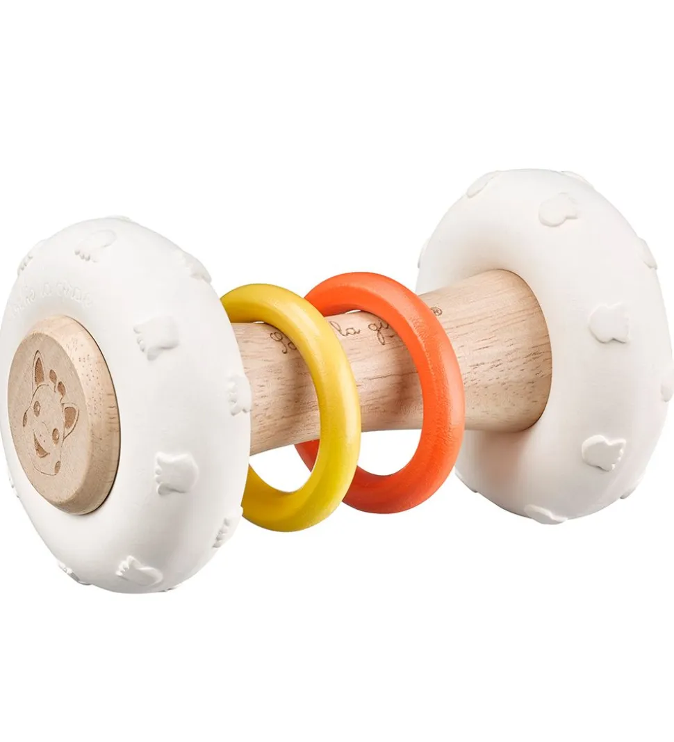 Sophie la Girafe rangle er nemt at tage fat i ved træhåndtagtet, hvor der også er to ringe, som bidrager med en rasleeffekt. Ranglen kan også trilles på de store gummiringe i enderne.