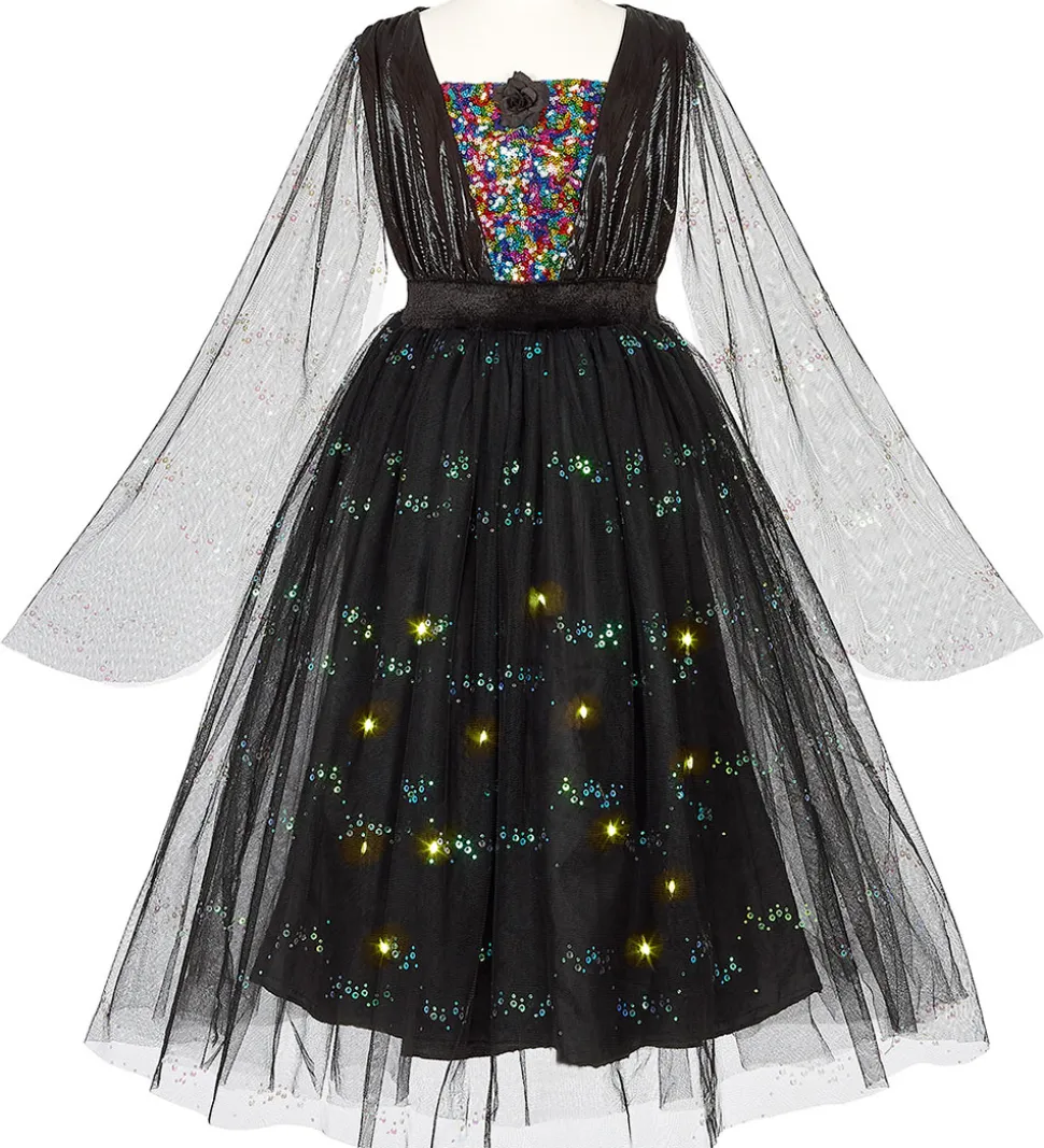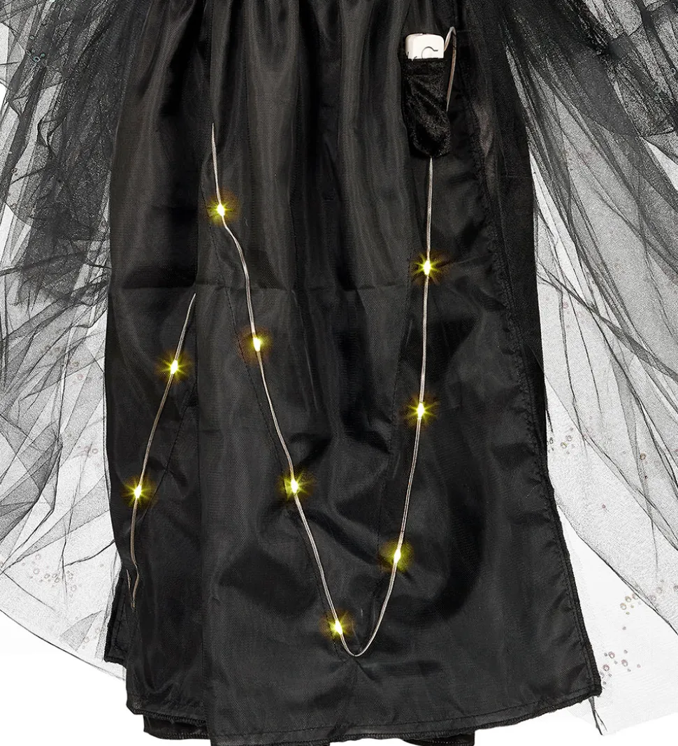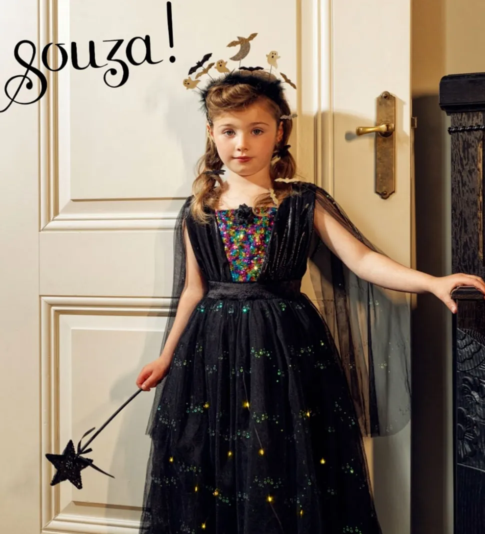Souza udklædningen er sort med tyl og farvestrålende pailletter, og som en ekstra, fortryllende detalje er der LED-lys gemt i kjolens skørt.