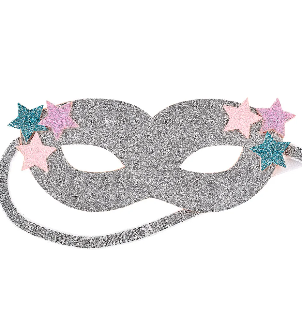Smart Souza maske som i sølvglimmer med forskelligfarvede glimmerstjerner i siderne.