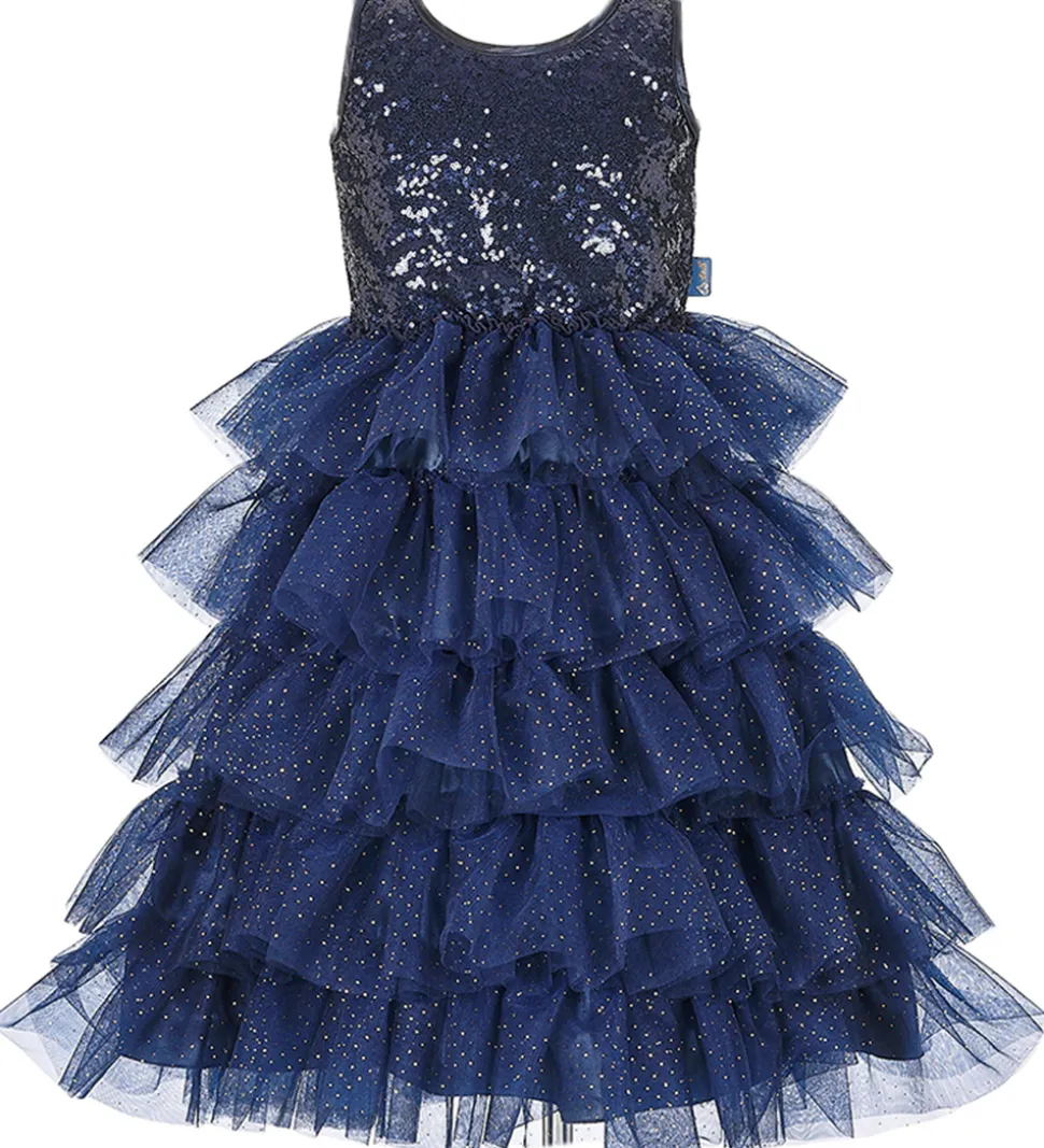 Souza udklædningen er i en flot, navyblå farve og dekoreret med palietter og små guldprikker. Prinsessekjolen har en rund udskæring, ingen ærmer, elastikkant om taljen og et stort skørt med tyl og mange lag.