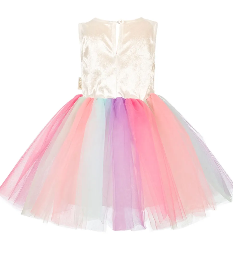 Charmerende Souza udklædning i form af en kjole med hvid top med palietter, enhjørningeprint og detaljer og et skørt med tyl i regnbuefarver.
