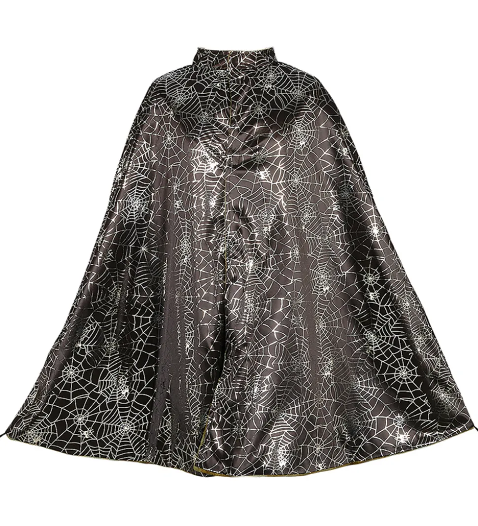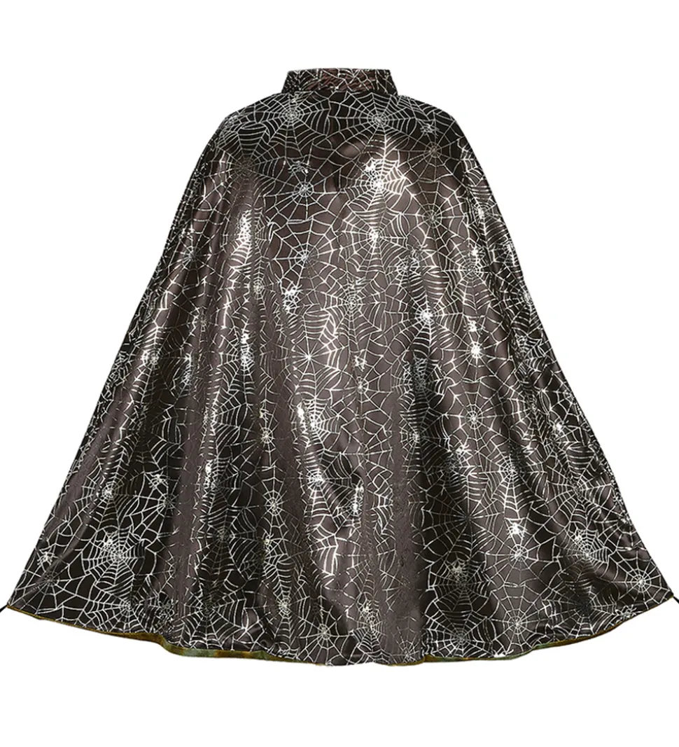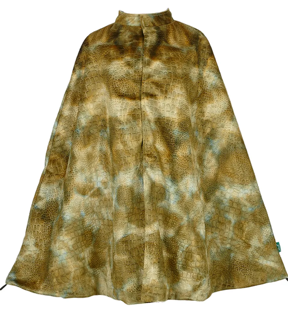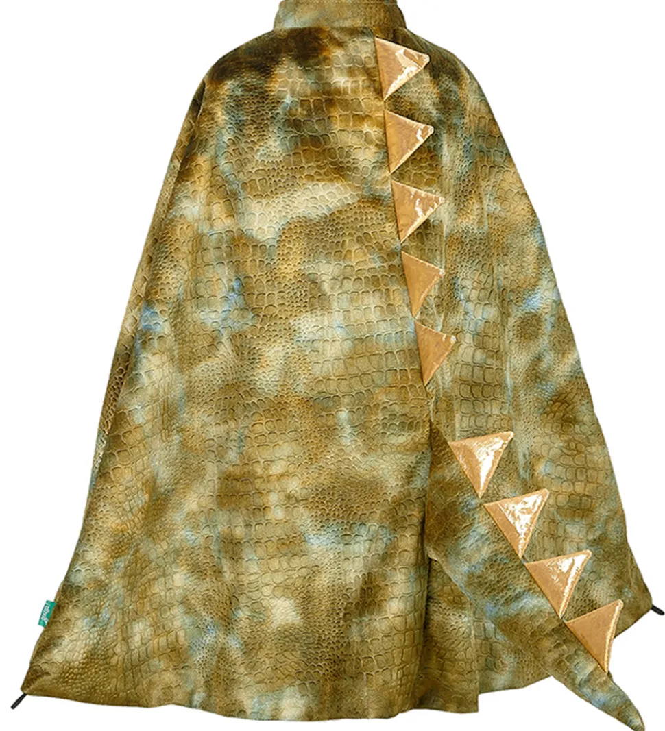 Souza udklædningen er på den ene side med dinohud i grønne nuancer samt dinotakker og -hale, mens den anden sider er i sort med sølvskinnende spindelvævprint. Kappen lukkes med velcro.