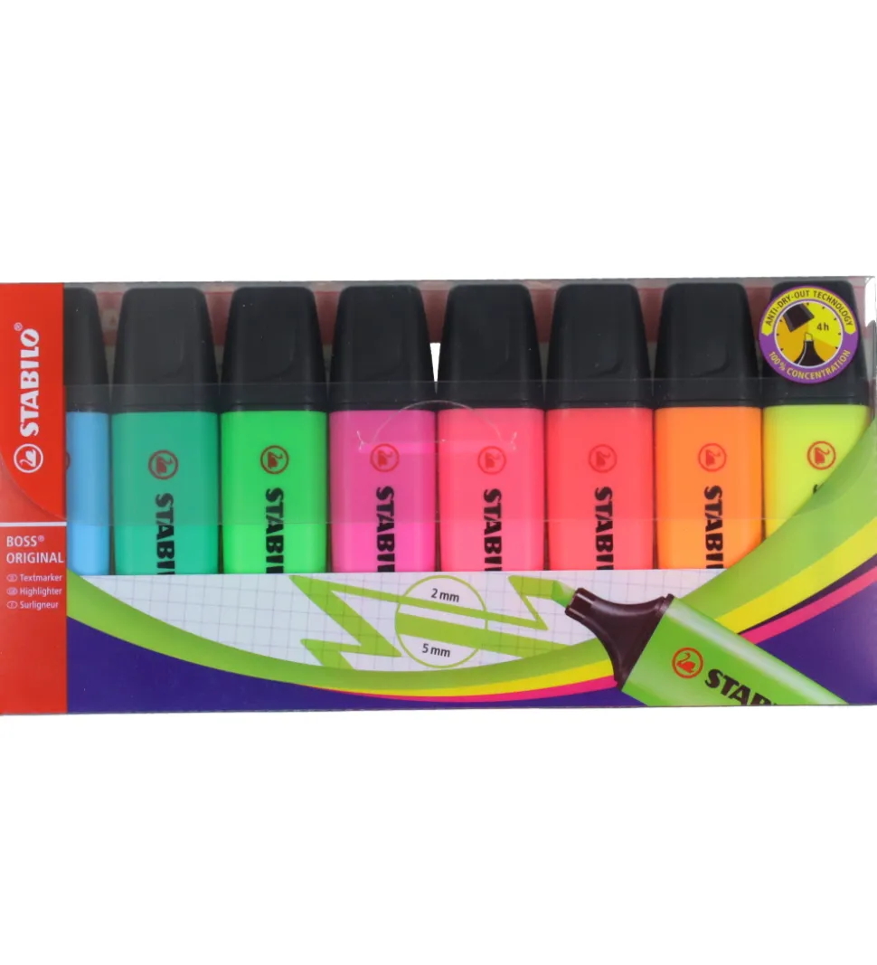 Fine Stabilo overstregningstuscher i otte forskellige farver.