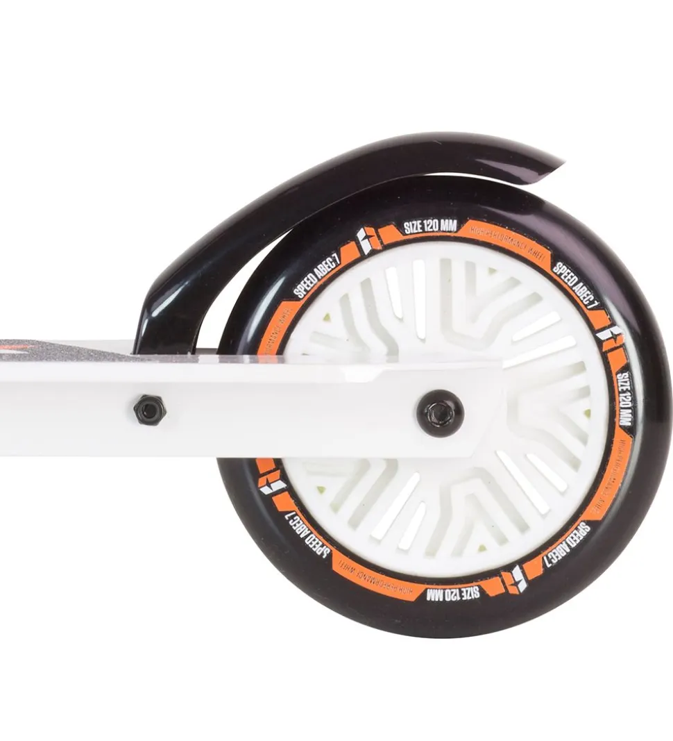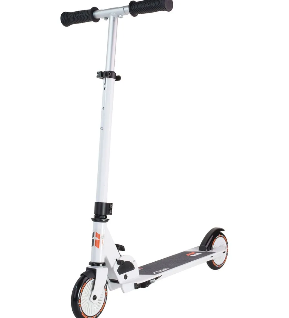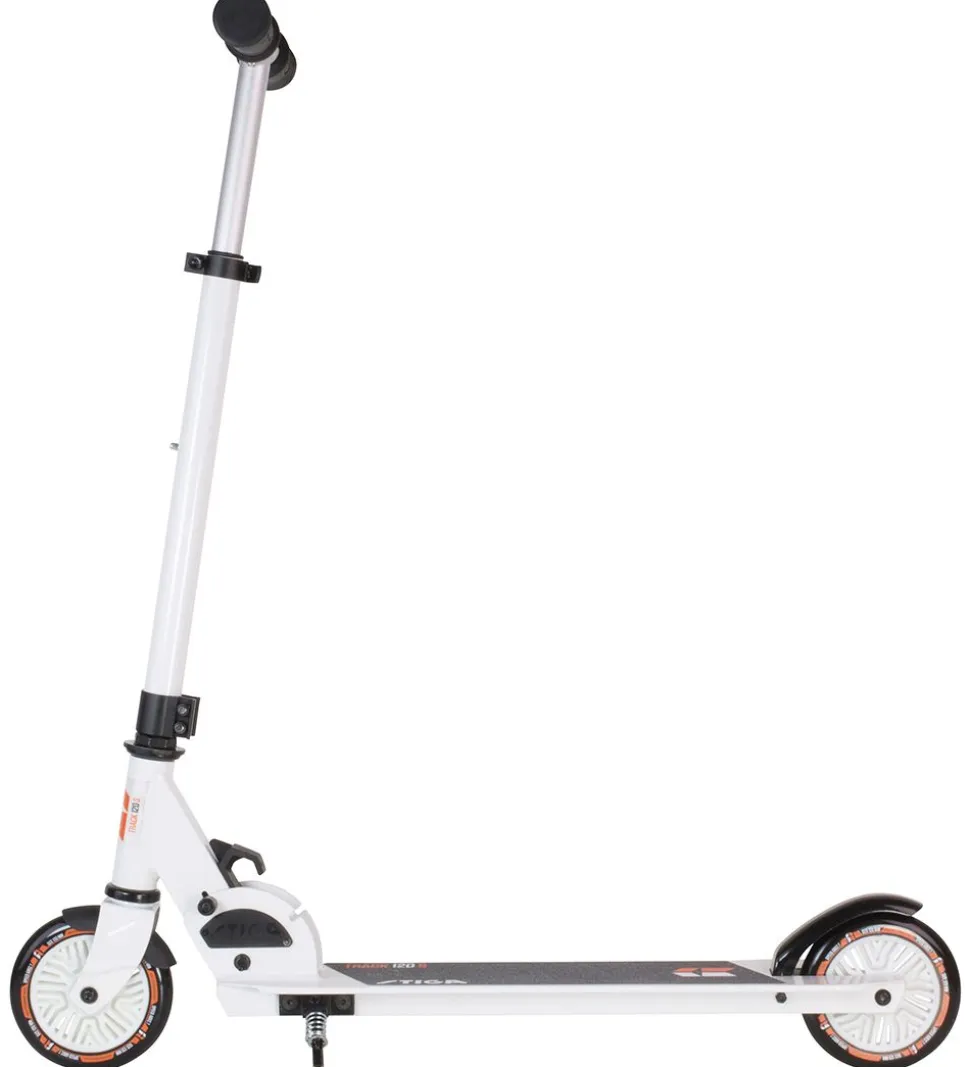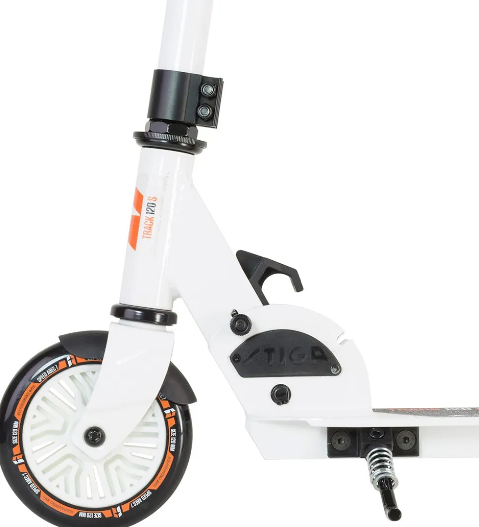 Smart Stiga løbehjul i en hvid aluminium/stål-ramme med orange detaljer, der kan foldes sammen.