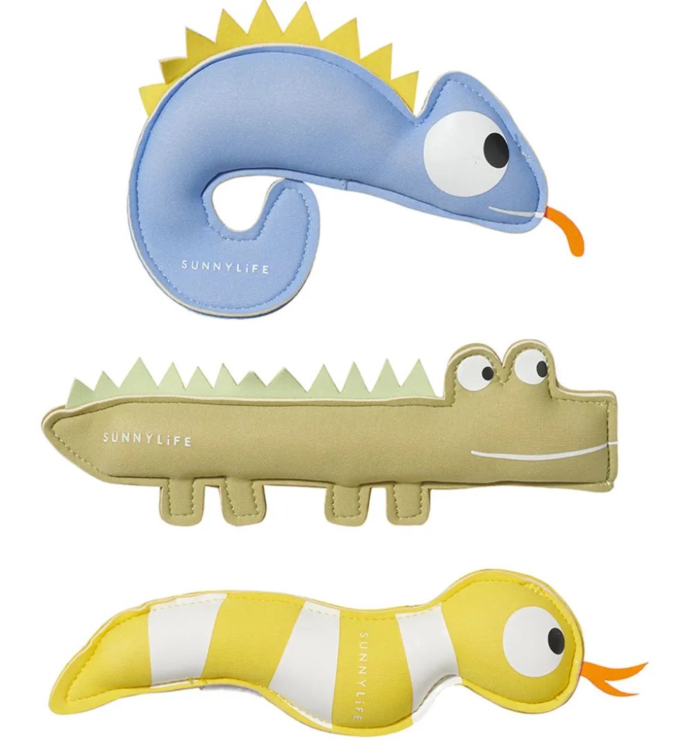 Sjove SunnyLife dykkervægte solgt i en 3-pak med form som en blå og gul kamæleon, en grøn krokodille og en slange med hvide og gule striber.