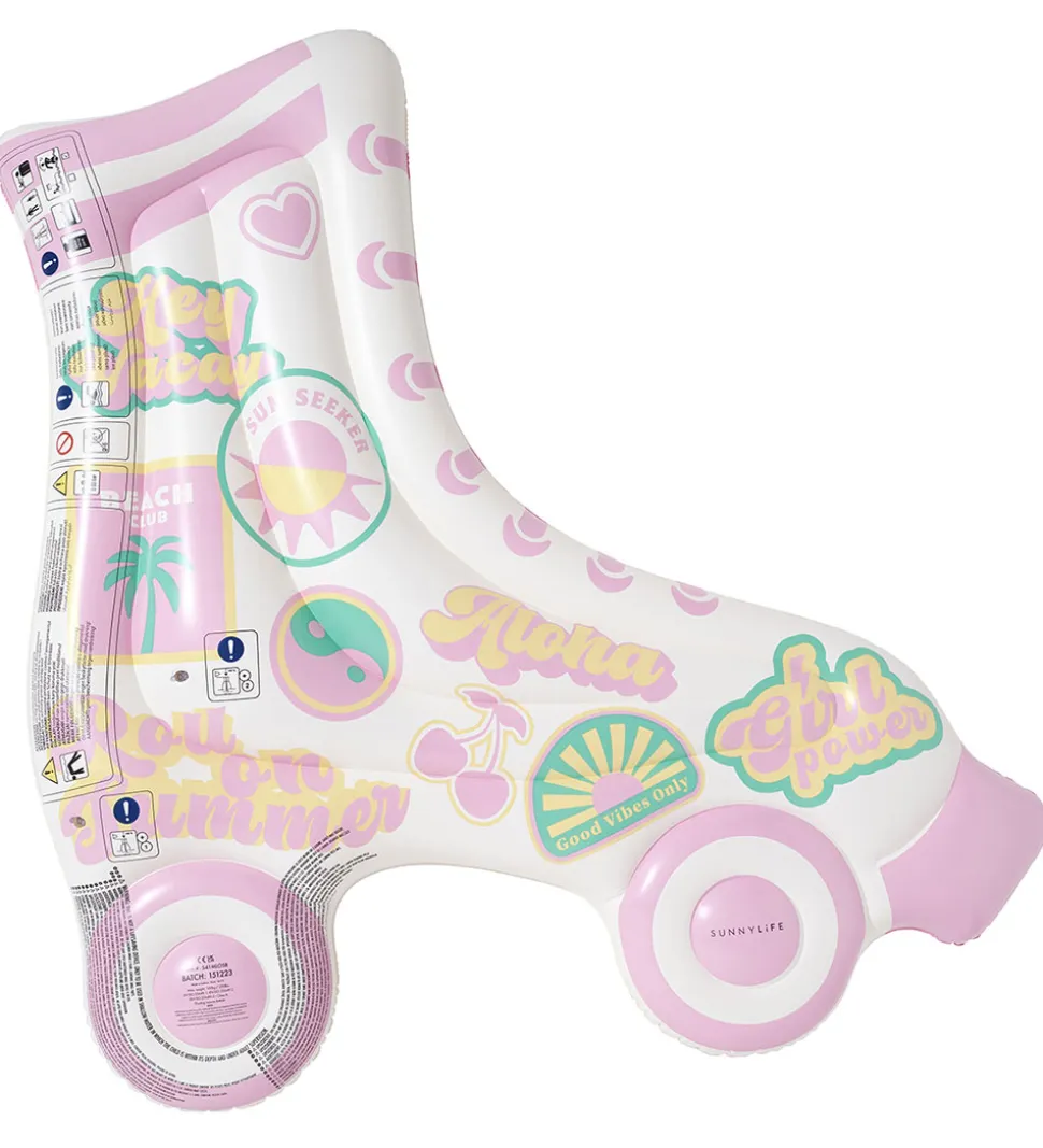 Sej SunnyLife flyder med form som en rulleskøjte i hvid, rosa og mintgrøn med print af seje stickers.