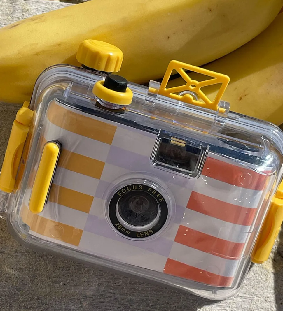 Sjovt SunnyLife undervandskamera med hvide, orange og røde i et design med striber.