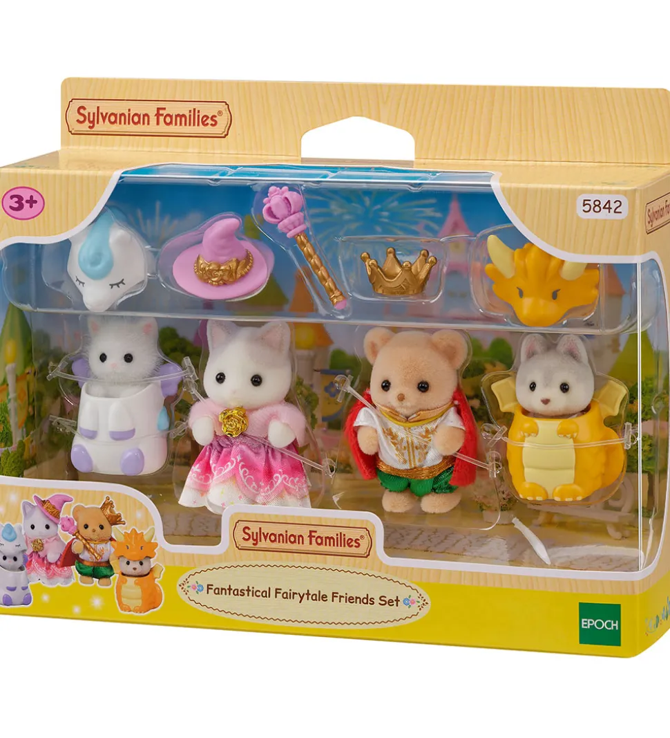 Sødt Sylvanian Families figursæt, der indeholder 4 figurer (forskellige dyr) og fire eventyrlige kostumer til figurerne.