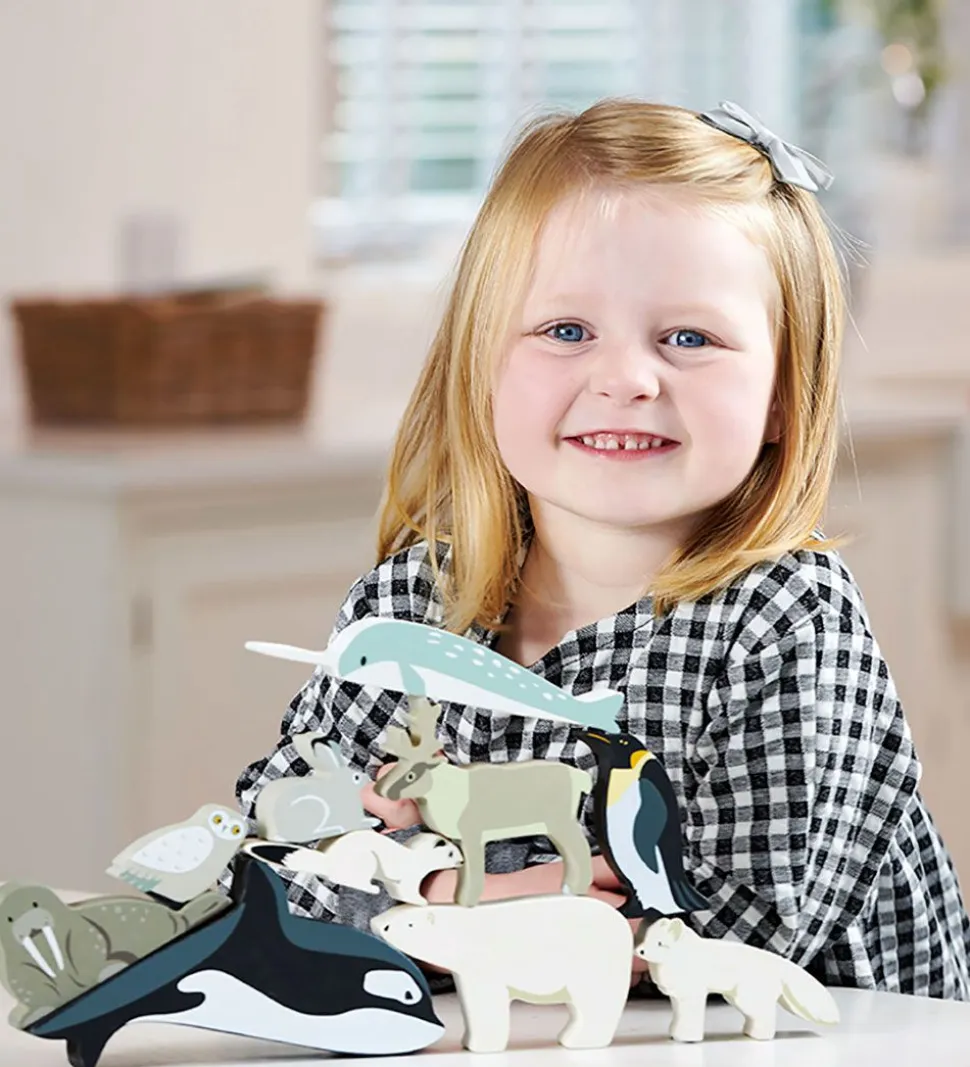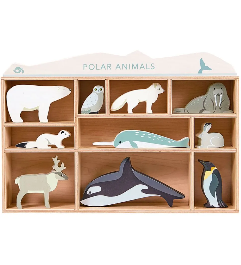 Flot Tender Leaf trælegetøj i naturlig træ og fine farver, som er formet som 10 søde polardyr.