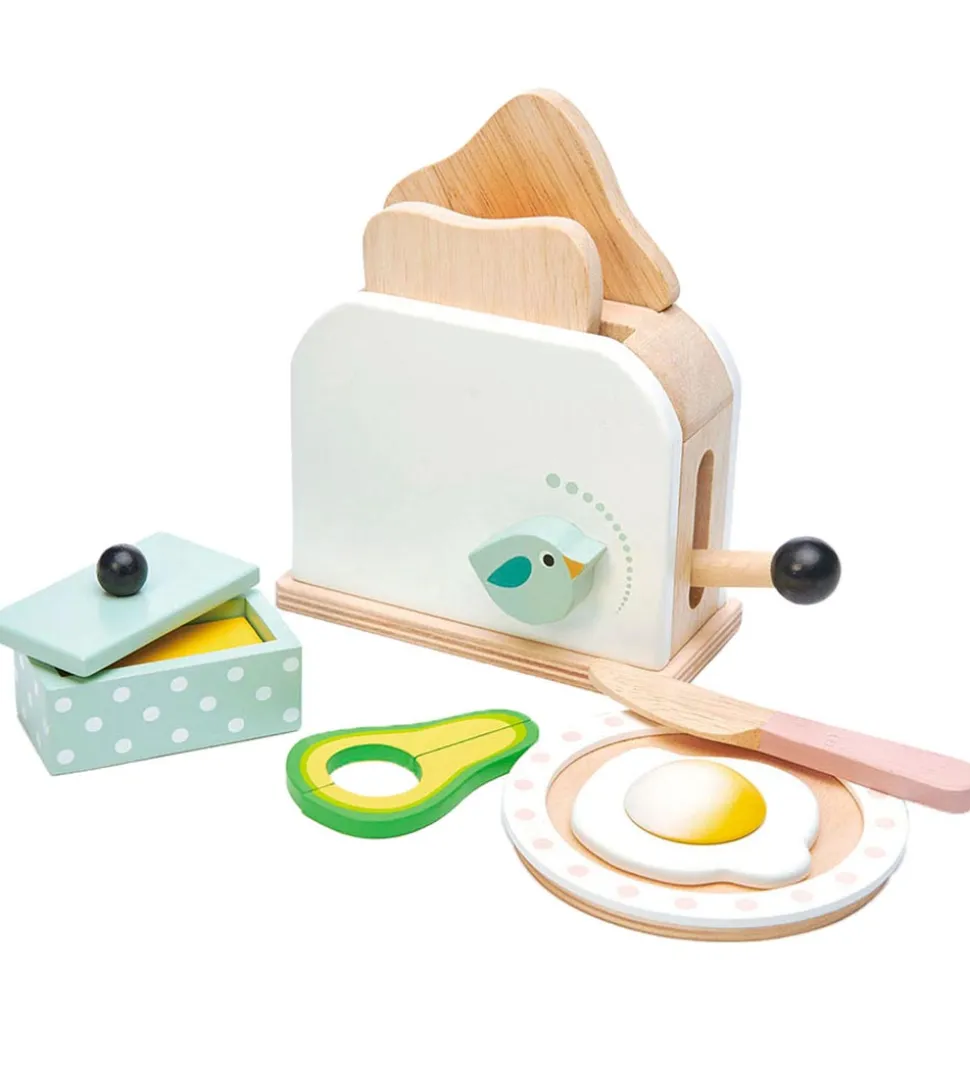 Fint Tender Leaf trælegetøj i naturlig træ og fine farver, som er formet som en brødrister med følgende ting: