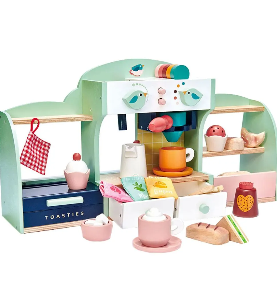 Sjovt Tender Leaf trælegetøj i naturlig træ og fine farver, som er formet som et cafe-sæt med følgende ting: