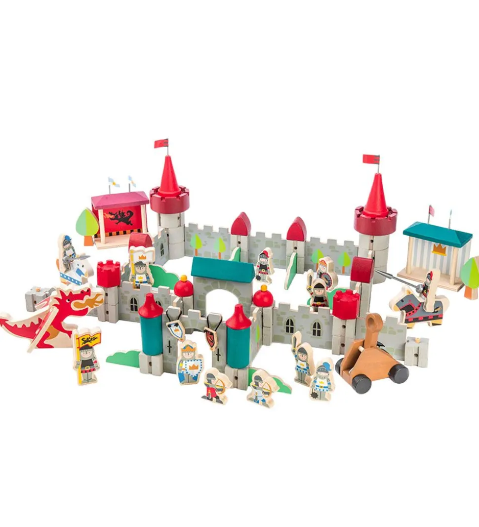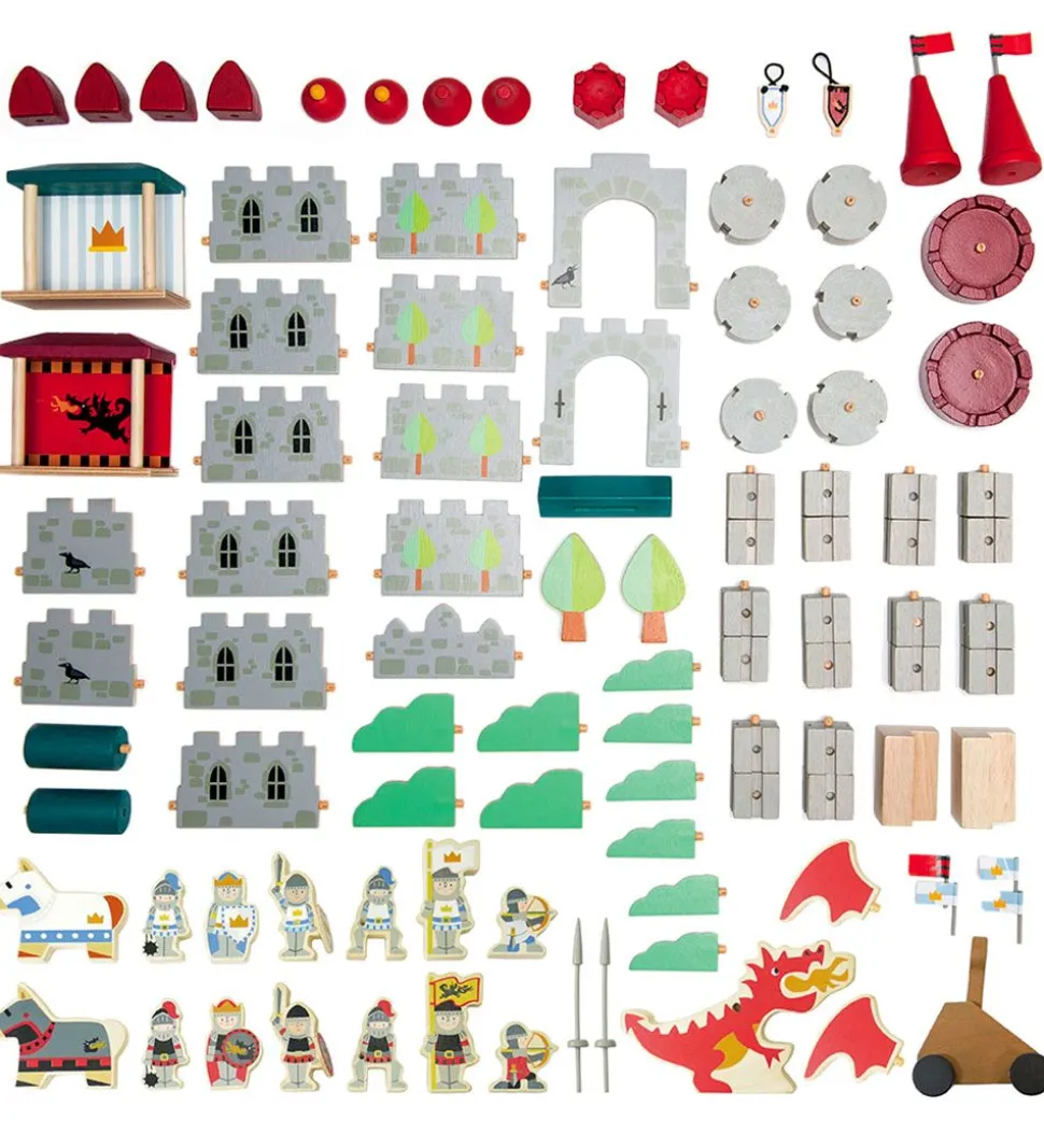 Tender Leaf trælegetøjet består af 100 dele til at bygge en stor ridderborg med 12 riddere, 2 heste samt 1 drage. Trælegetøjet byder på mange timers underholdende leg, og det er med til at stimulere og udvikle barnets fantasi, finmotorik, sprog og kommunikation.