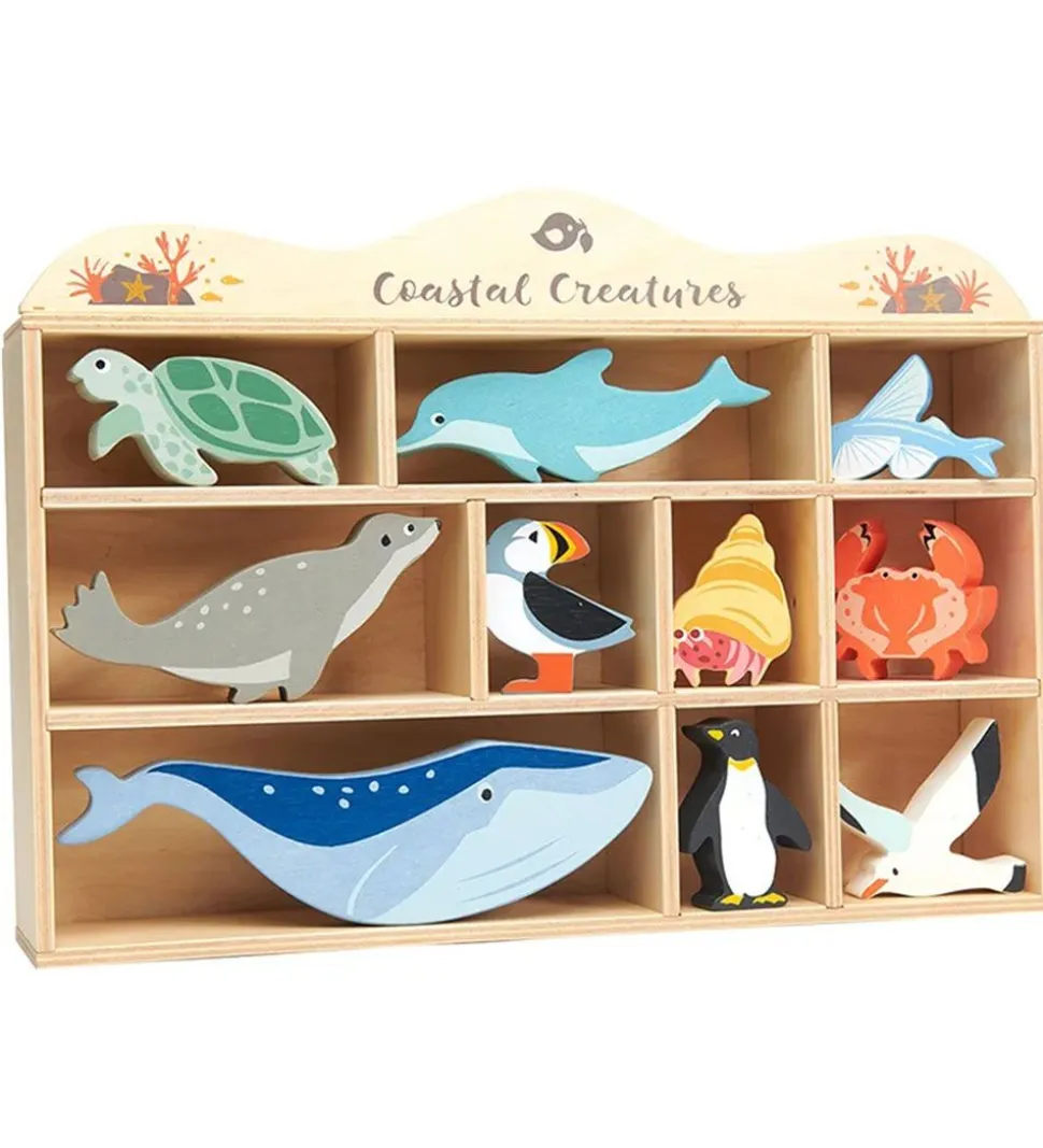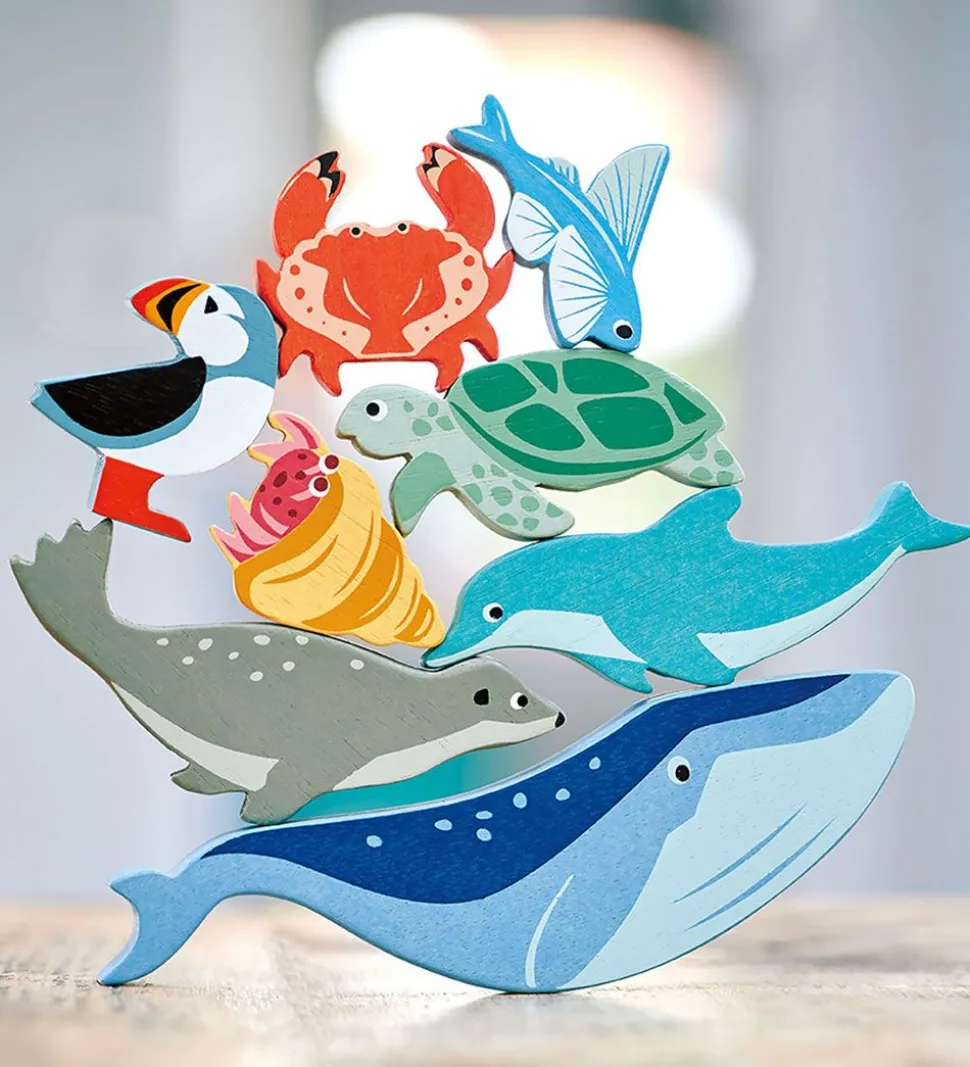 Flot Tender Leaf trælegetøj i naturlig træ og fine farver, som er formet som 10 søde havdyr.