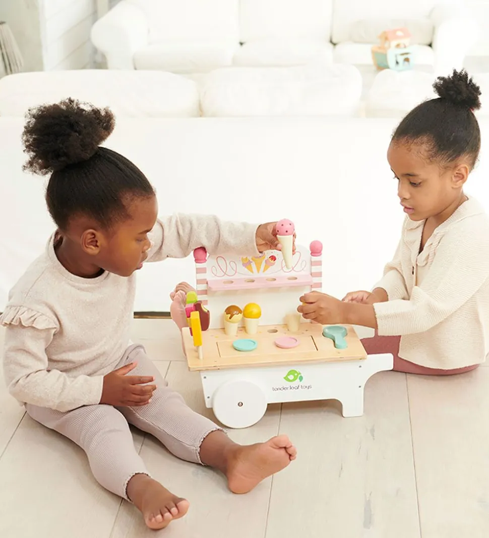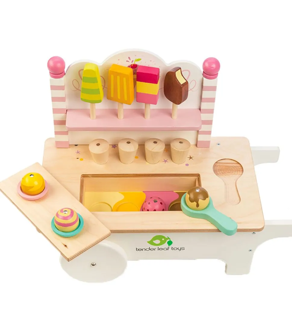 Sjovt Tender Leaf trælegetøj i naturlig træ og fine farver, som er formet som en isvogn med følgende ting: