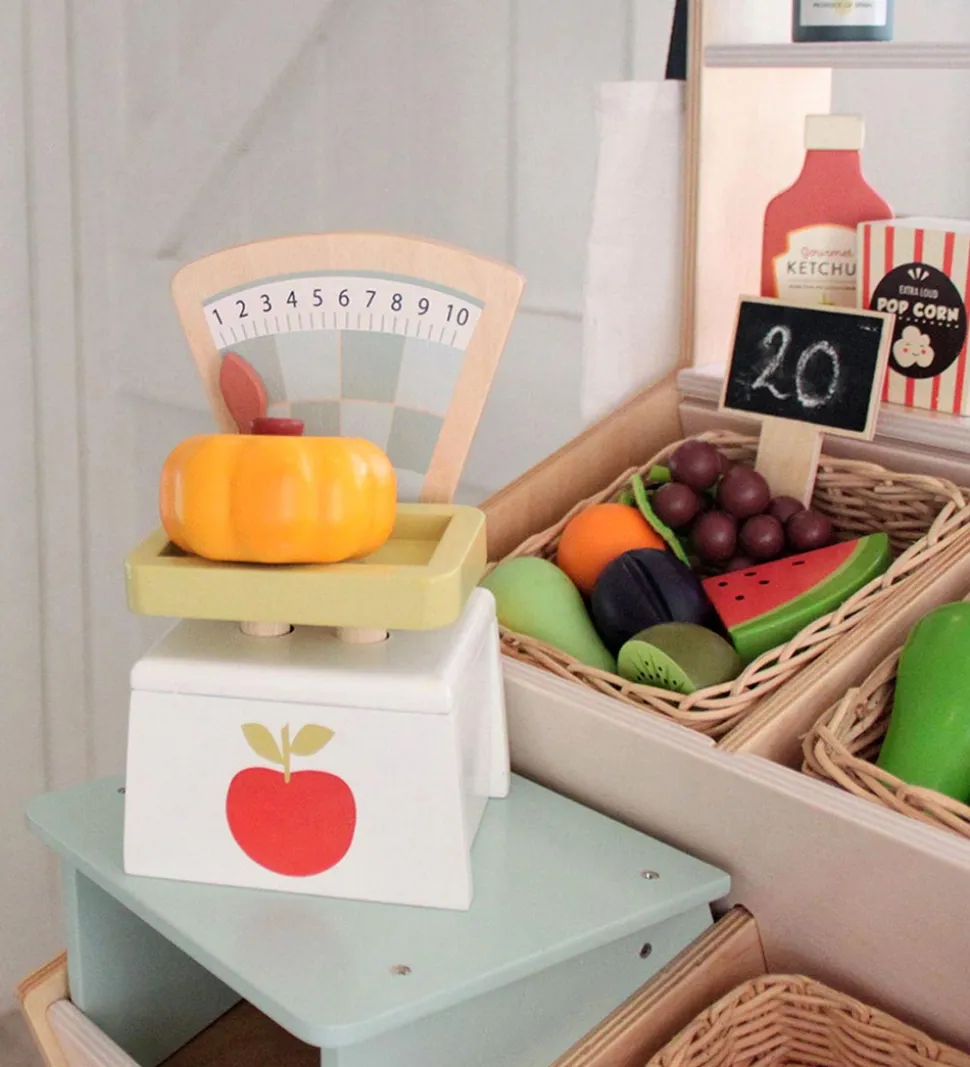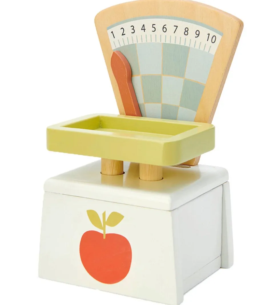 Sjovt Tender Leaf trælegetøj i naturlig træ og fine farver, som er formet som en vægt som barnet kender fra købmanden.