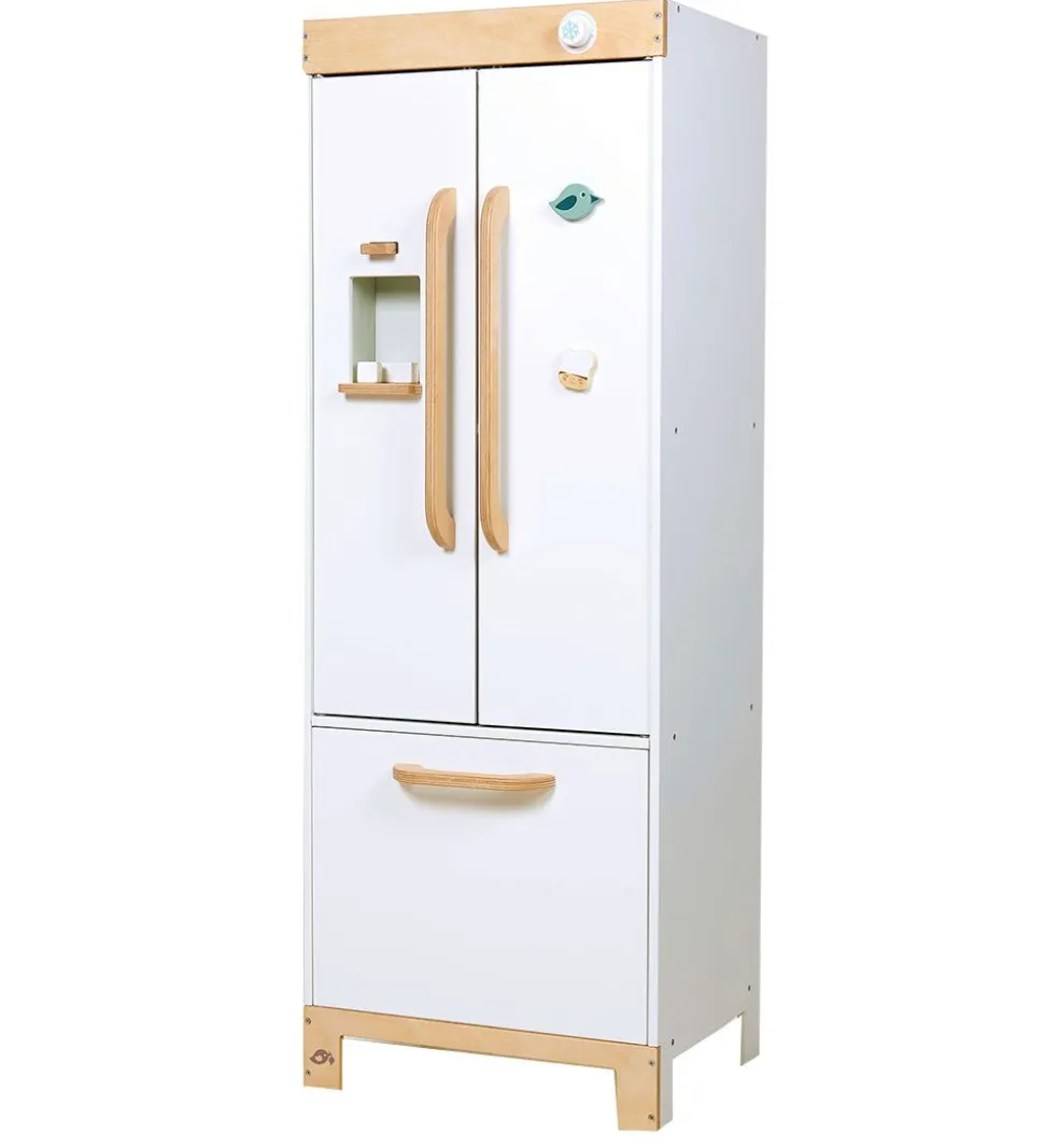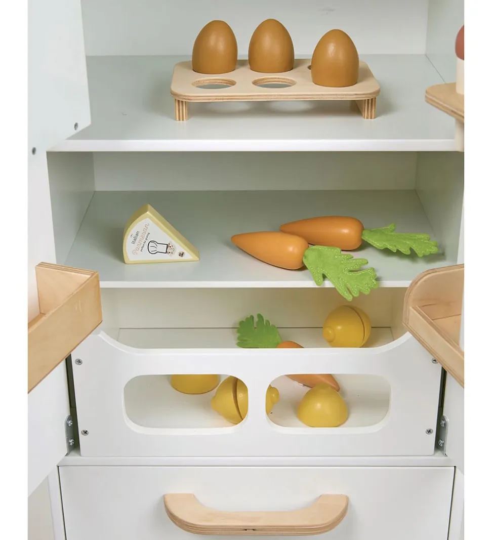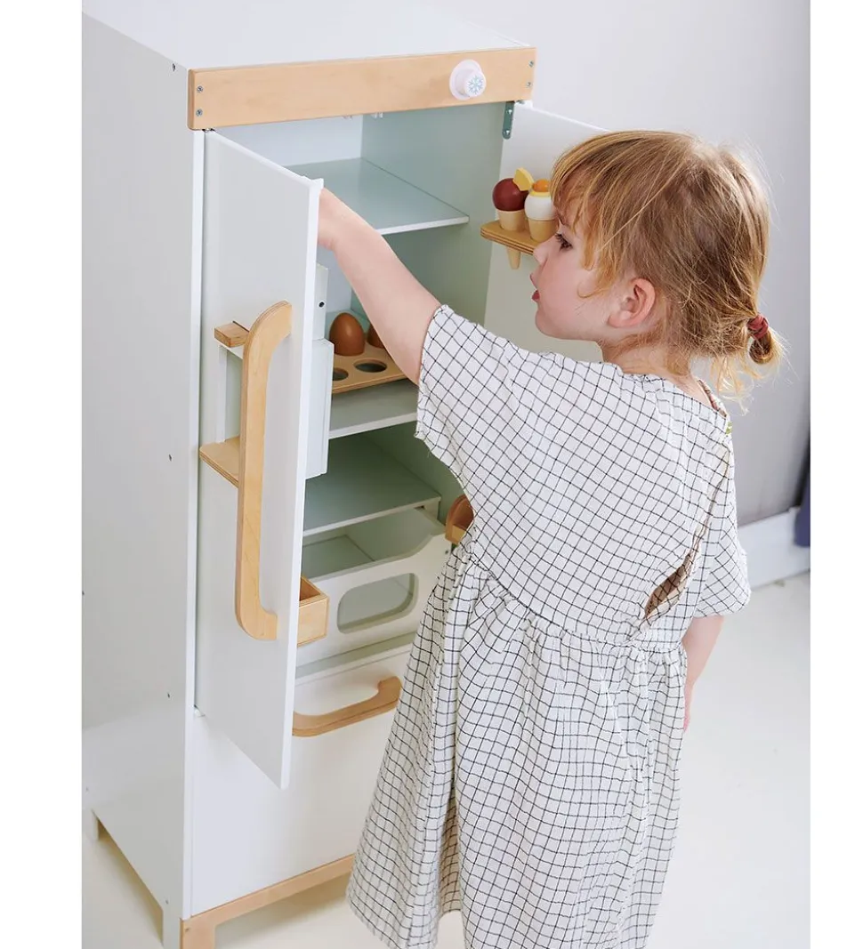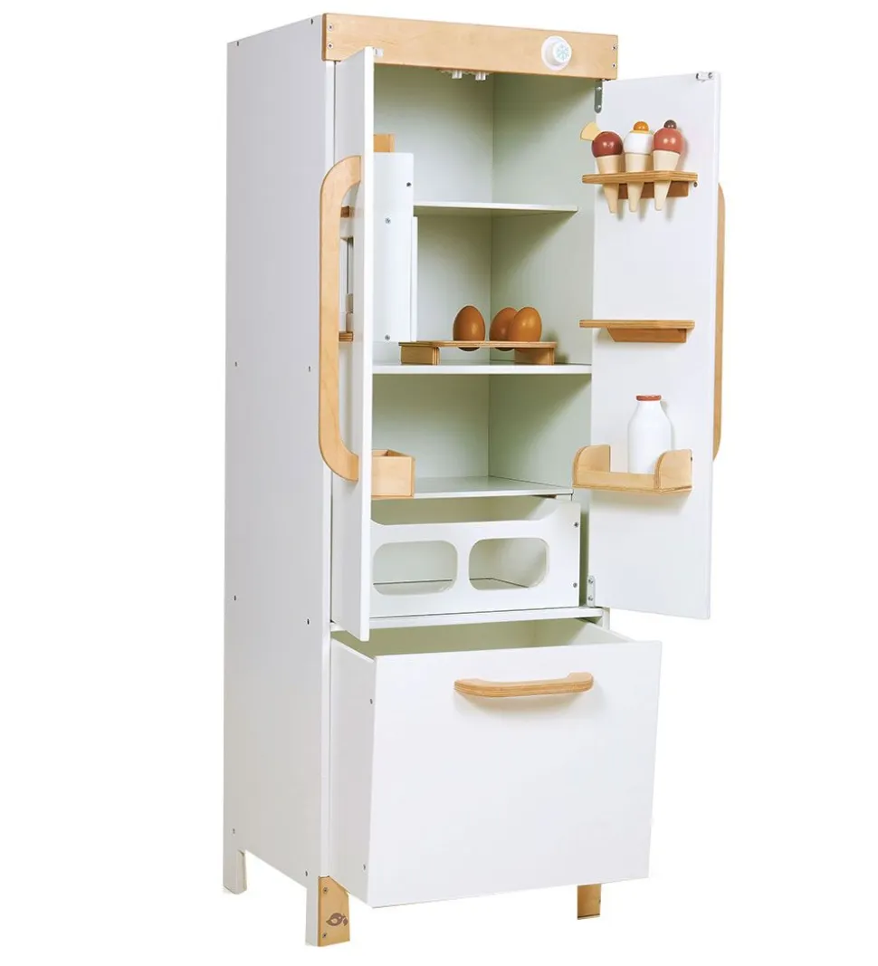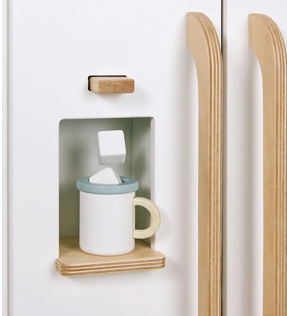 Tender Leaf trælegetøjet er formet som et stort køleskab, hvor låger og skuffe kan åbnes, så det virker realistisk. På ydersiden i den ene side er der en isterningmaskine, som virker meget realistisk, hvor der kommer isterninger ud ved tryk på en knap. Med alt det medfølgende mad kan legen blive spændende for barnet. Med de medfølgende magneter kan der hænges fine tegninger op på køleskabet.