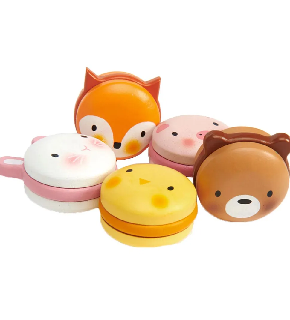 Søde Tender Leaf trælegetøj i naturlig træ og fine farver, som er formet som fem forskellige macarons i følgende farver: