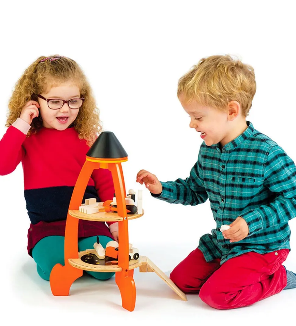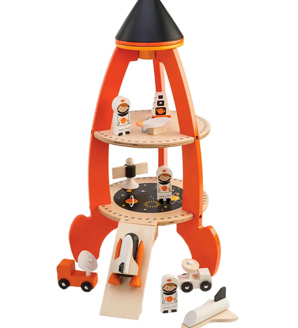 Fint Tender Leaf trælegetøj i naturlig træ og fine farver, som er formet som en rumraket med følgende ting:
