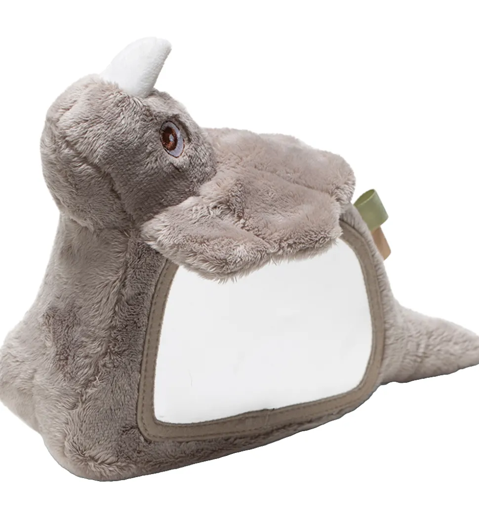 Sjovt That’s Mine aktivitetsspejl, der er udformet som en grå bamsedino med et spejl på siden.
