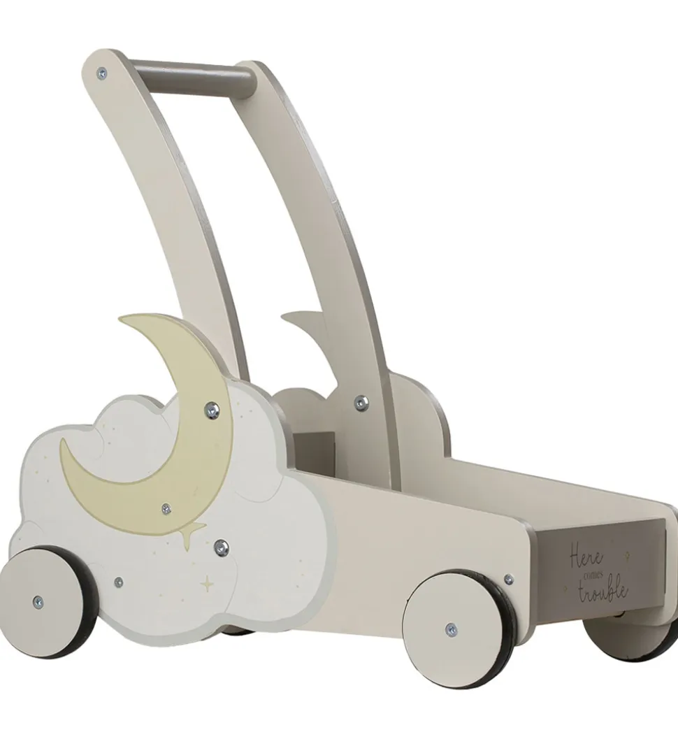 Sjovt That’s Mine gåvogn i gråmalet træ med hvide skyer samt gule måner og stjerner på siderne.