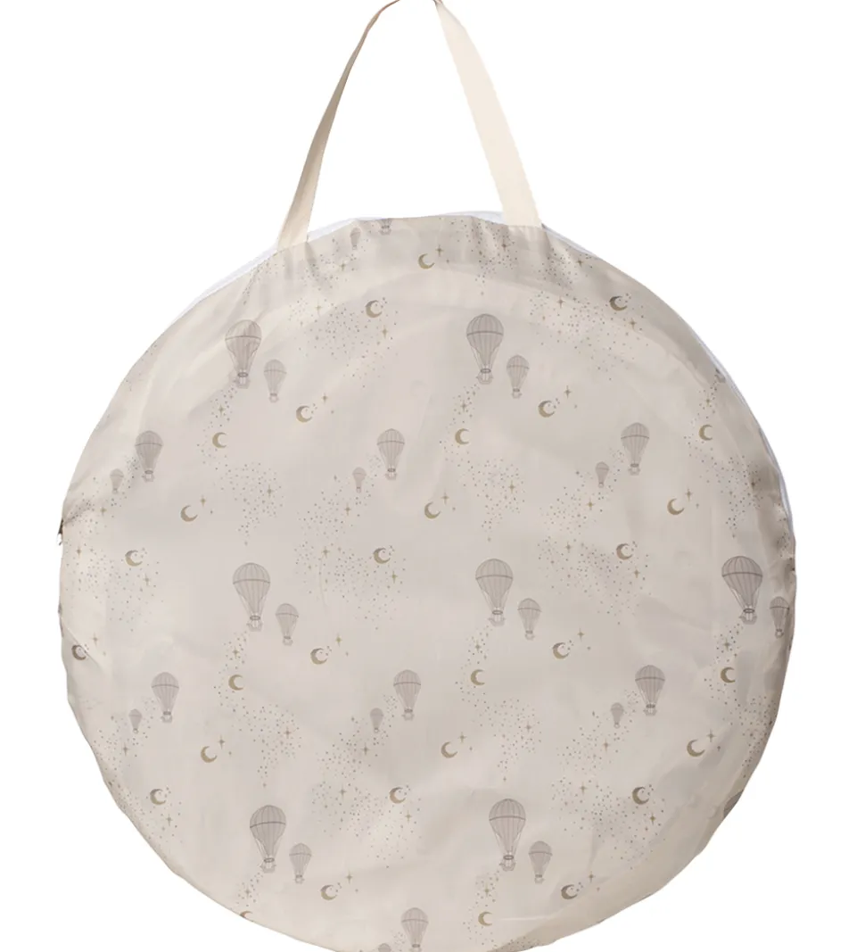 Sjov That’s Mine legetunnel i cremehvid med et alloverprint af luftballoner, måner og stjerner i beige og gule farver.