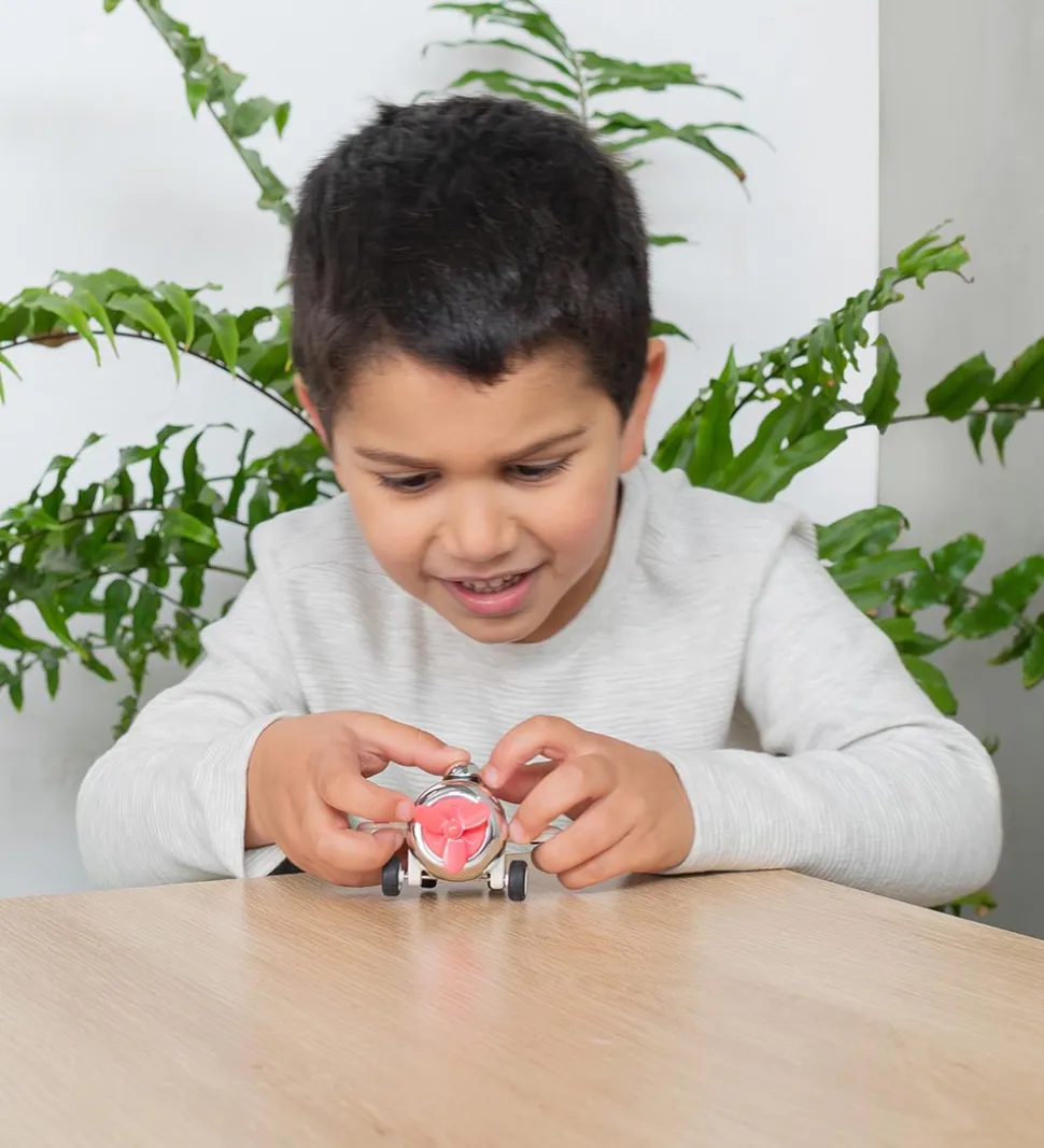 Flot Tiger Tribe flyvemaskine i creme med detaljer i sølv og flerfarvet stribemønster. Flyvemaskinen “Drifter” kan køre (ikke flyve), når man trykker piloten på hovedet, og bruger ikke batteri.