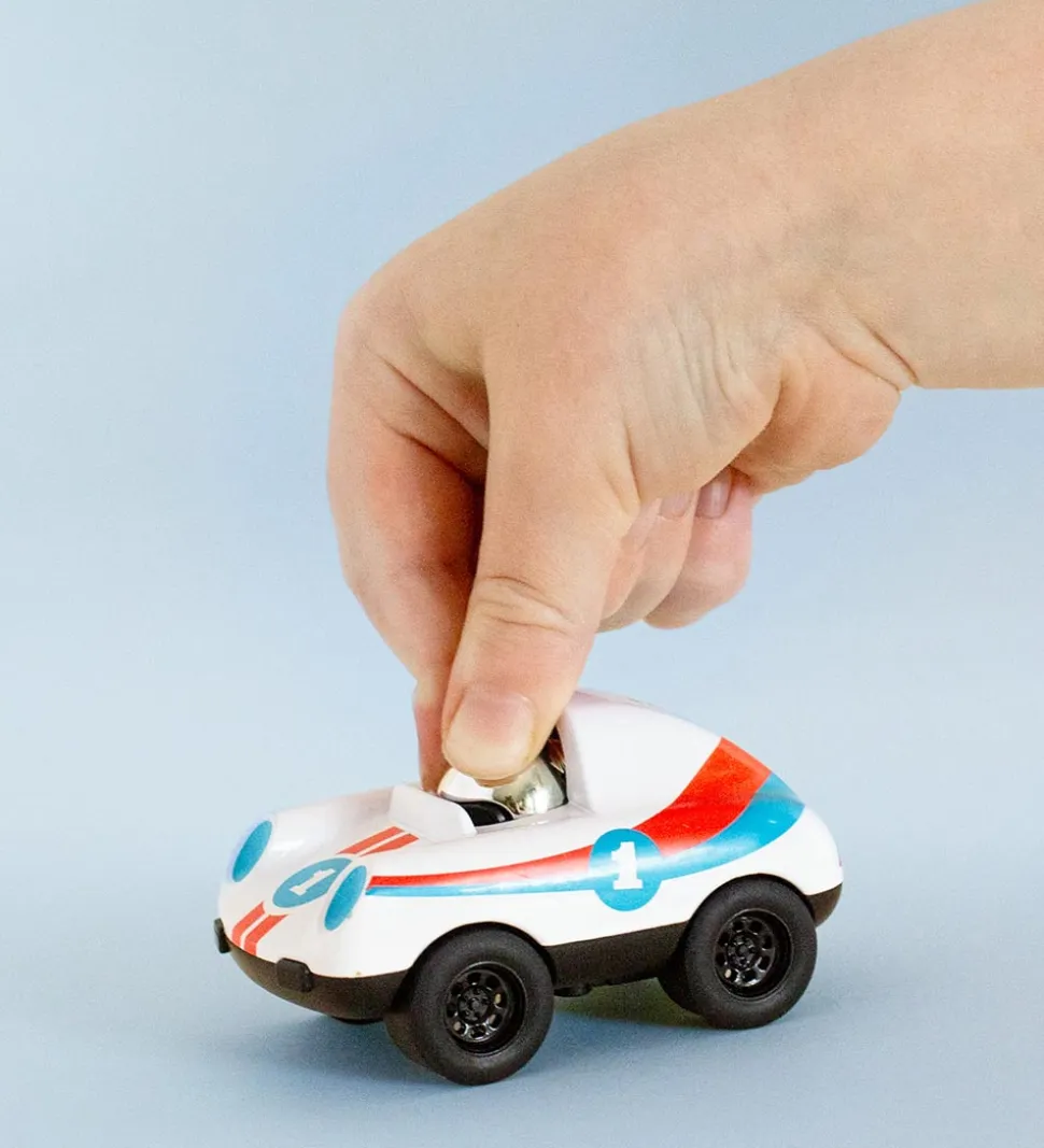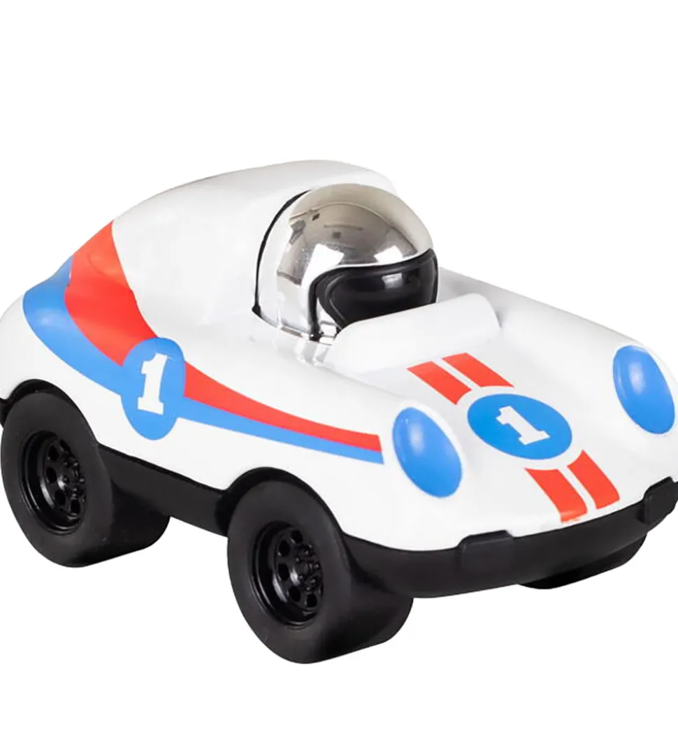 Flot Tiger Tribe racerbil i hvid med seje detaljer i rød og blå. Racerbilen “Ace” kan køre, når man trykker chaufføren på hovedet.