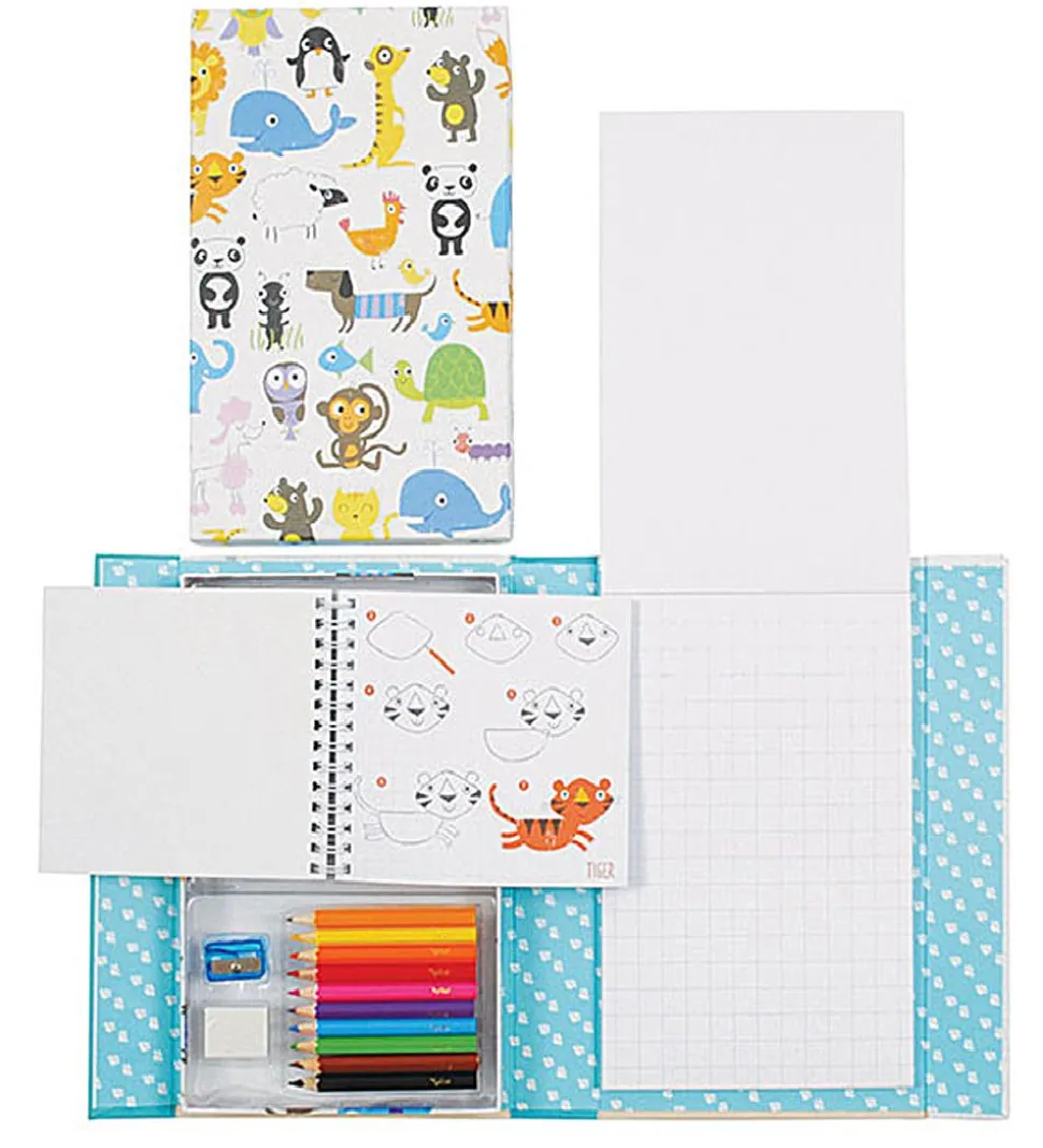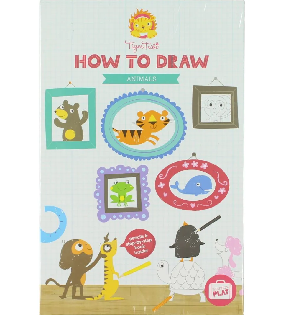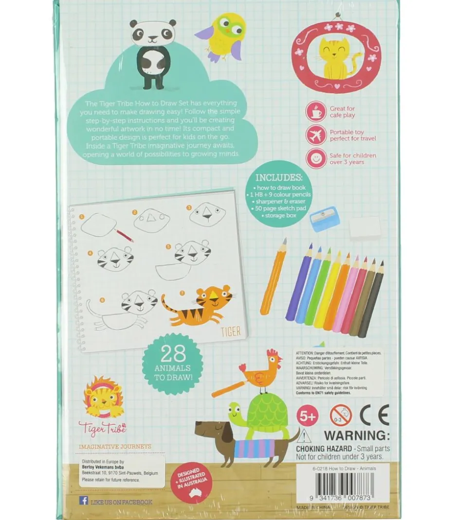 Tiger Tribe tegnesættet lærer dig at tegne flotte tegninger. Det består af en praktisk opbevaringsæske med en blyant samt 9 farveblyanter, et viskelæder og en blyantspidser, en bog med trin for trin-vejledninger til 24 forskellige dyr samt en papirblok med 50 sider.