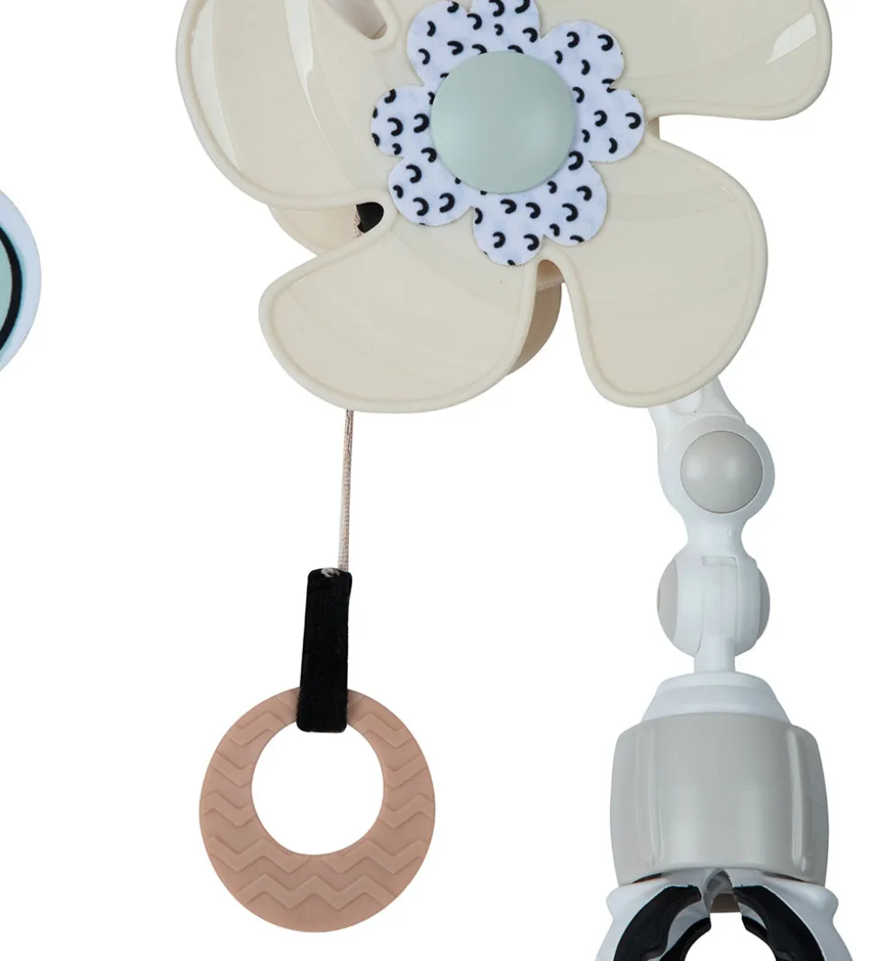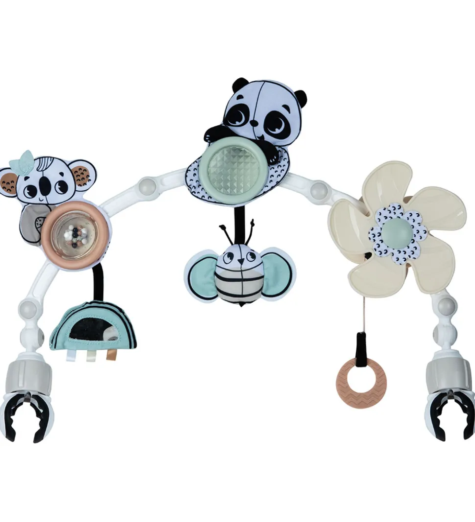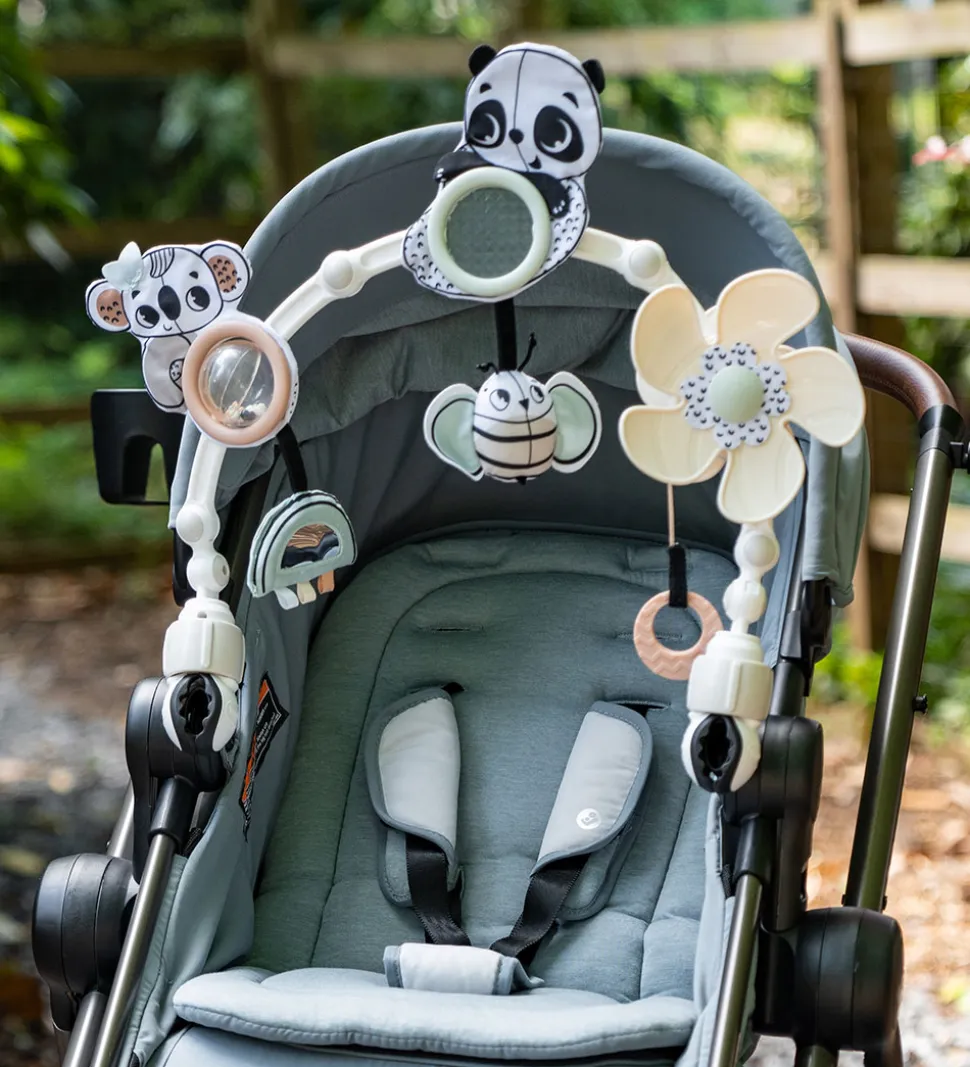 Sød Tiny Love barnevognskæde i dæmpede farver med søde dyr- og blomster.