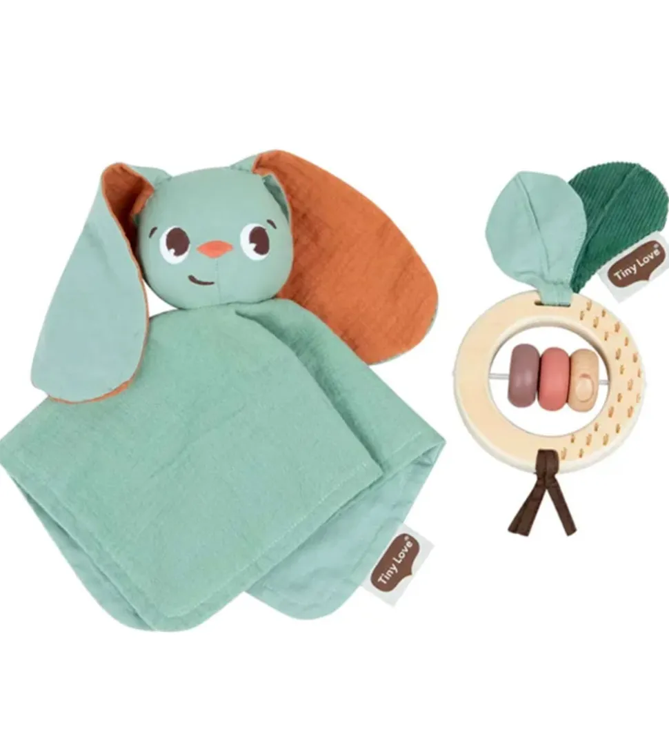 Sød Tiny Love gaveæske som indeholder en nusseklud og en rangle. Nussekluden har form som en kanin i støvet blå med røde ører og et sødt, broderet ansigt. Ranglen er i træ med fine, grønne blade af stof på toppen.