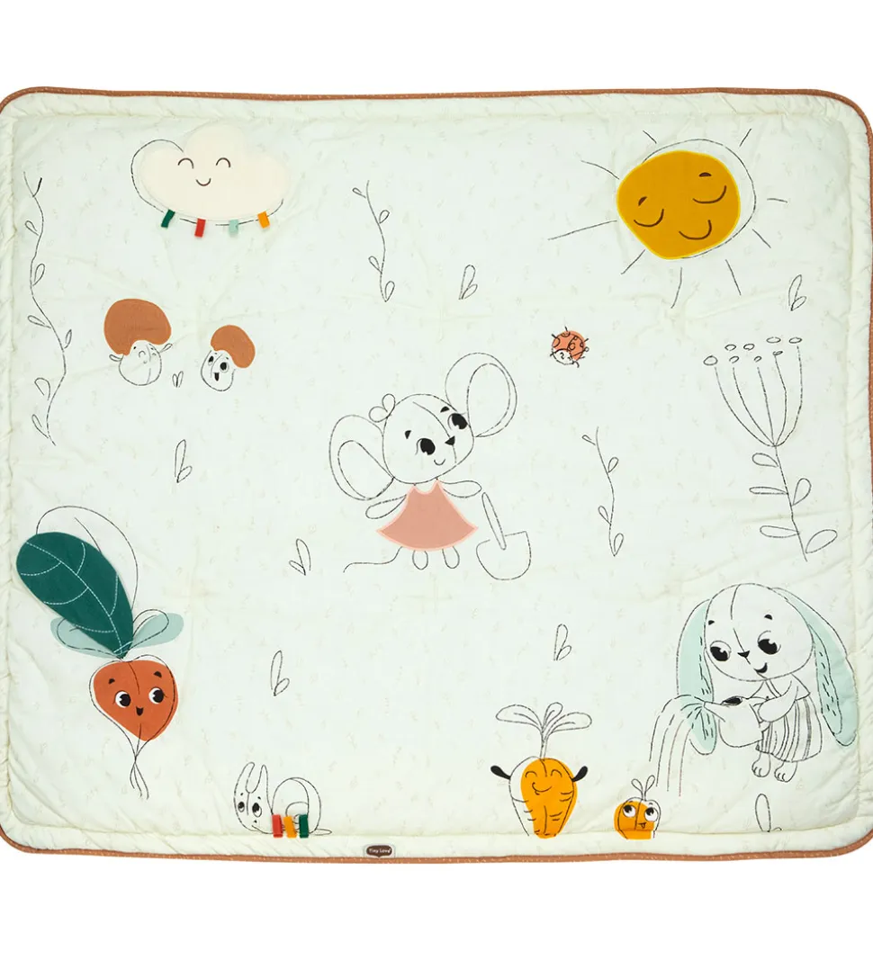 Sødt Tiny Love legetæppe i hvid med forskellige motiver af kaniner, gulerødder og vejr-elementer.