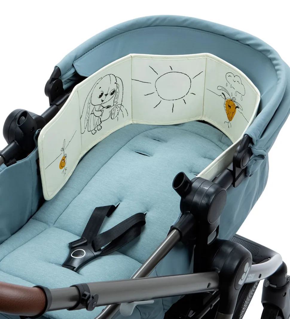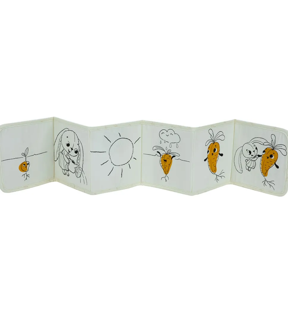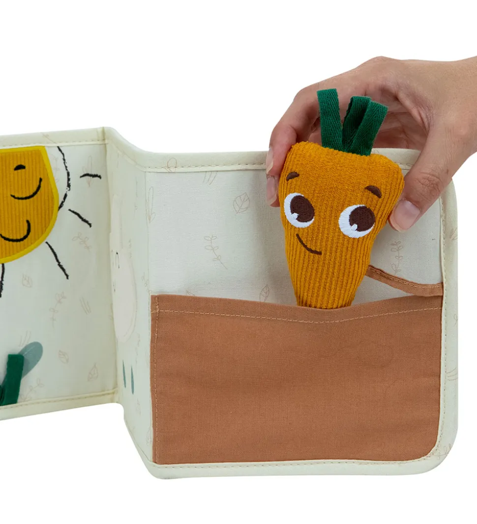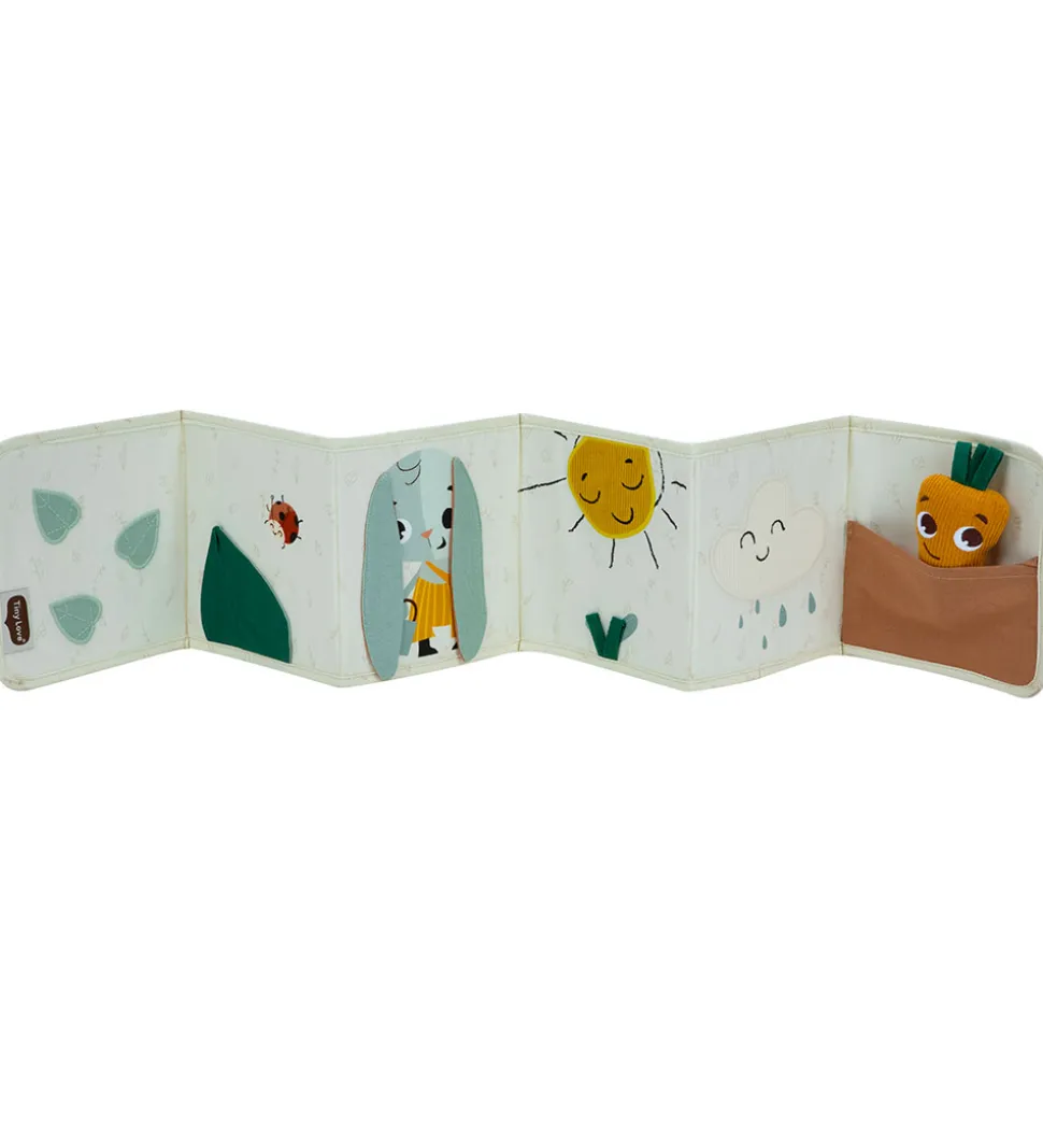Fin Tiny Love stofbog med motiver af kaniner, gulerødder og vejr-elementer.
