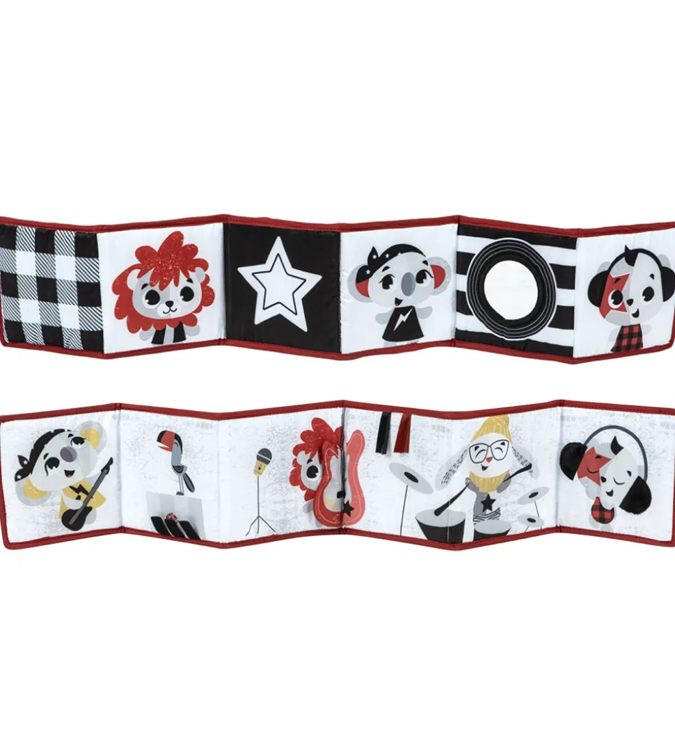 Sød Tiny Love stofbog med motiver af søde dyr i sort, hvid og rød.