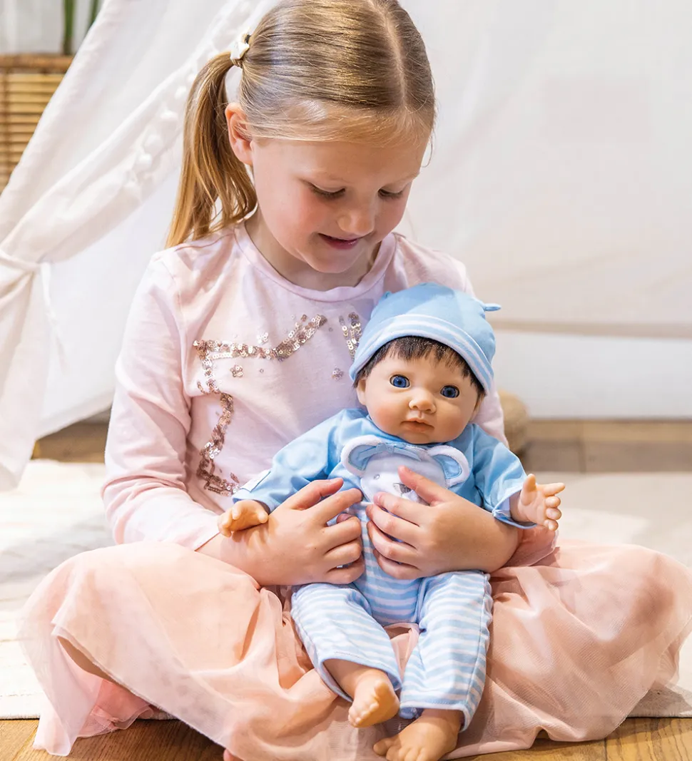 Fin Tiny Treasures dukke med mørkt hår. Dukken er iført en blå hue og en heldragt i ensfarvet blå og stribet blå og hvid med en applikation af en bamse på maven.
