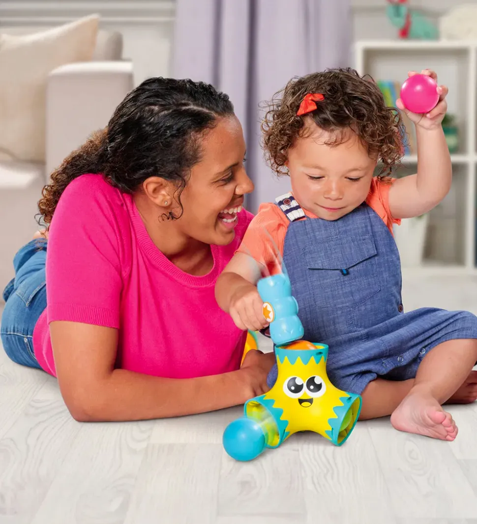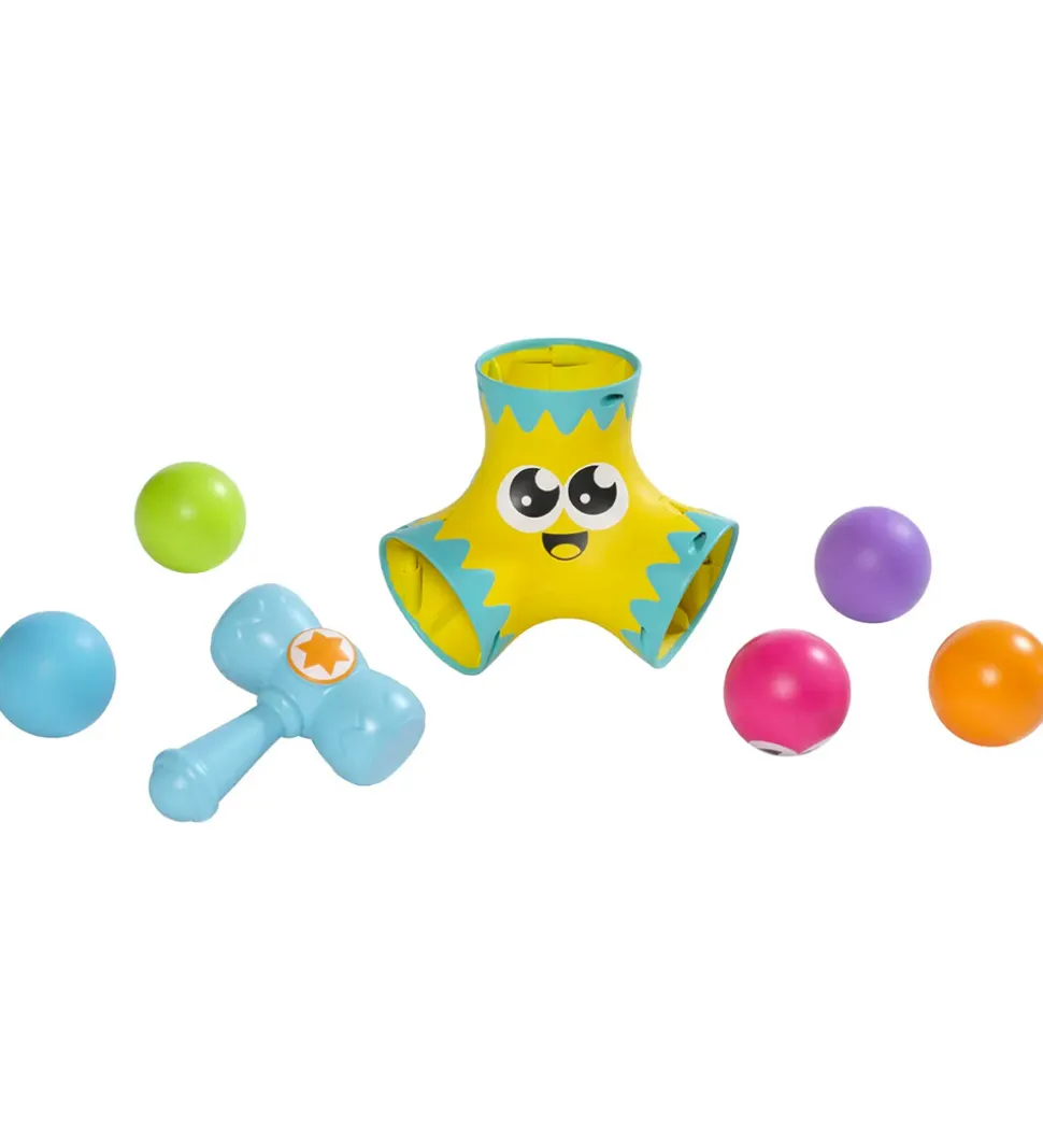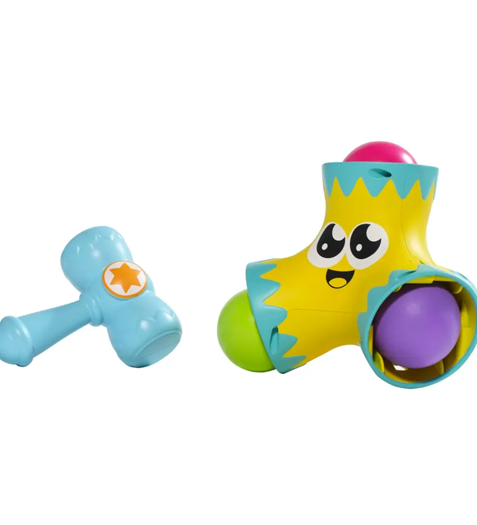 Toomies aktivitetslegetøjet inkluderer en hammer og farverige bolde, der engagerer og underholder de helt små, samtidig med at det styrker finmototikken.