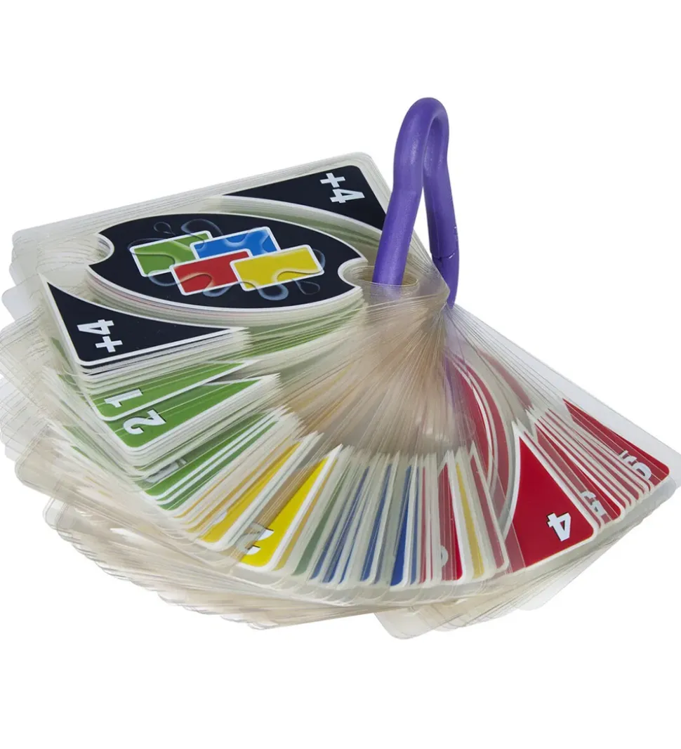 I denne udgave af UNO er kortene vandtætte og gennemsigtige, så man kan medbringe dem overalt. Kortspillet kommer med en praktisk karbinhage, der gør det nemt at have dem med på farten.