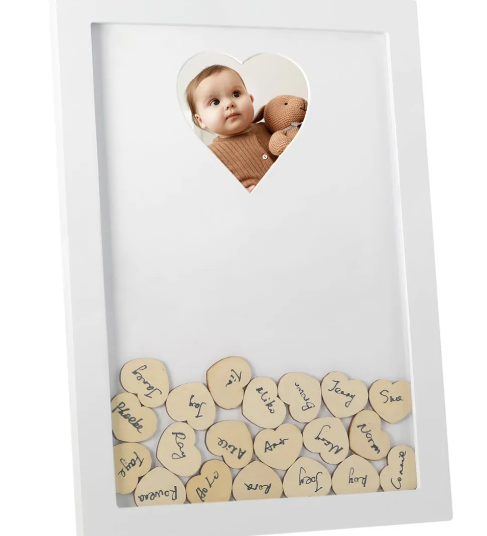 Træhjerterne kan ens gæster skrive deres navne på og komme dem i billedrammen via en sprække øverst. Der er også en mindre hjerteudskæring, hvor der sættes et lille billede i.