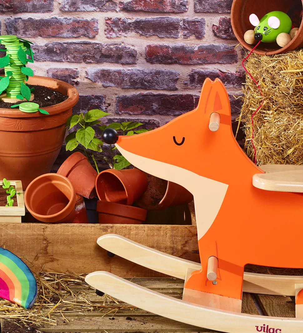 Fin Vilac gyngehest i lakeret træ og formet som en orange ræv med farverige detaljer.
