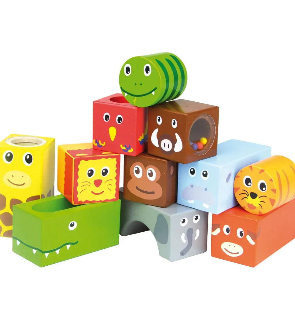 Sjove Vilac klodser i træ i forskellige former med motiver af dyr fra junglen.