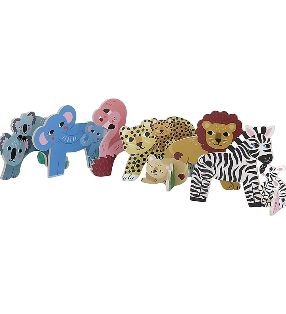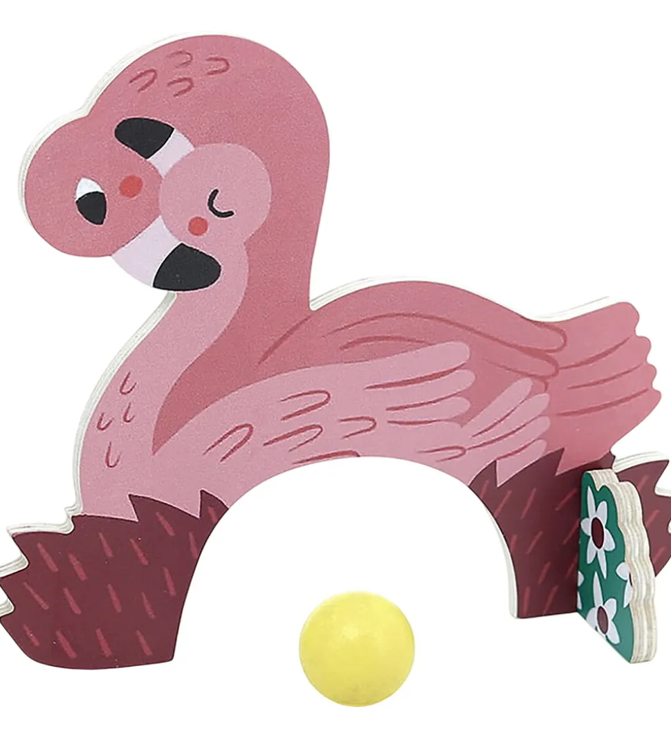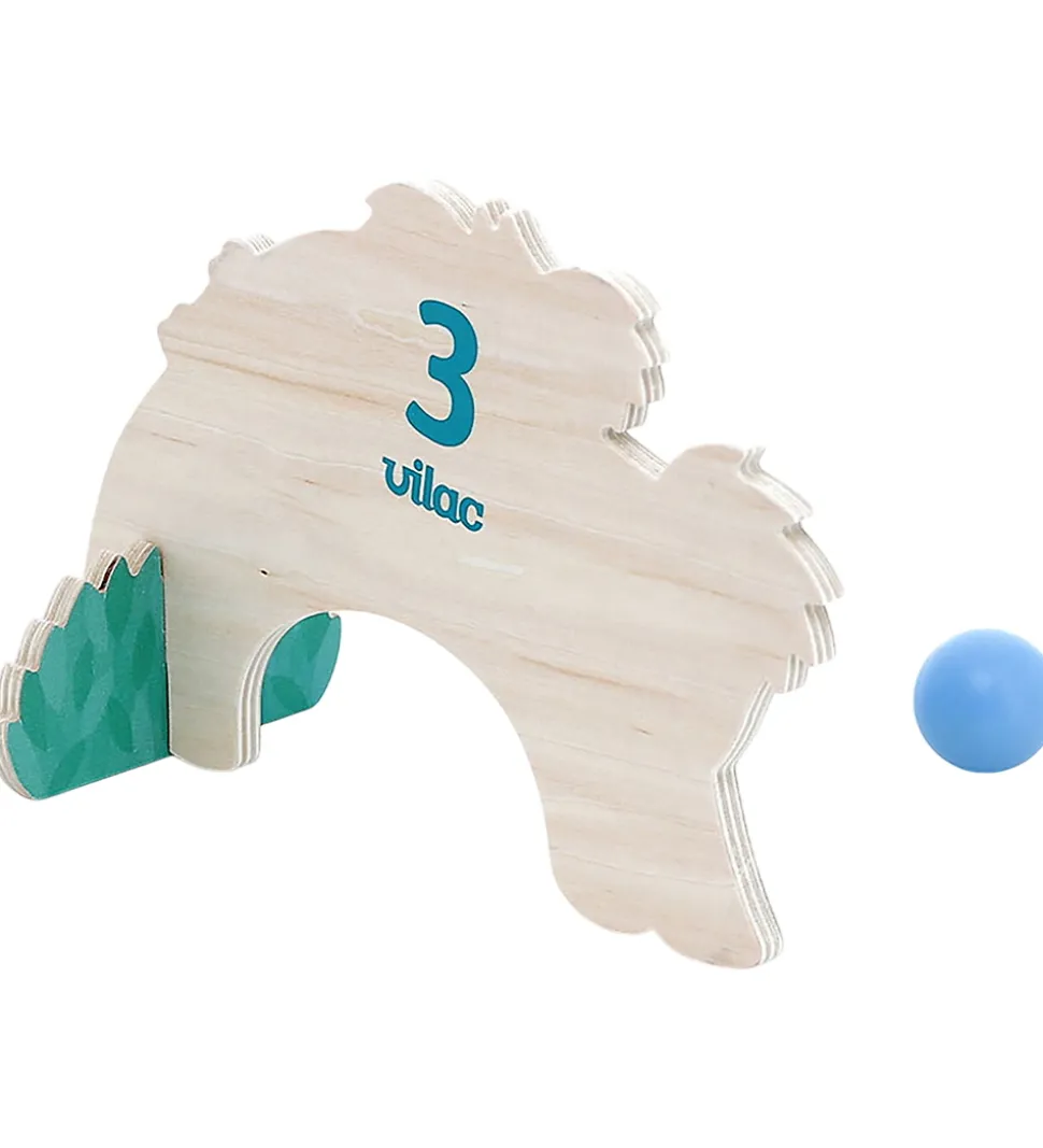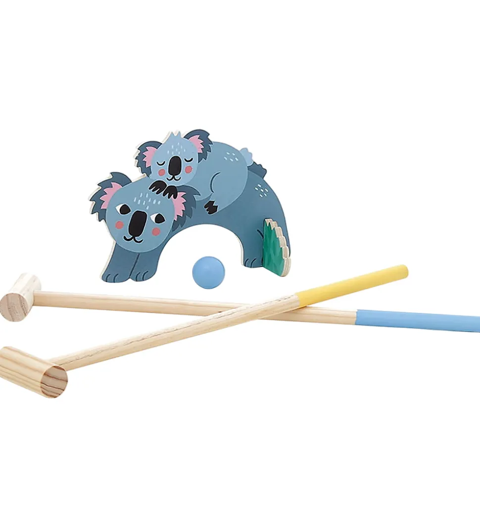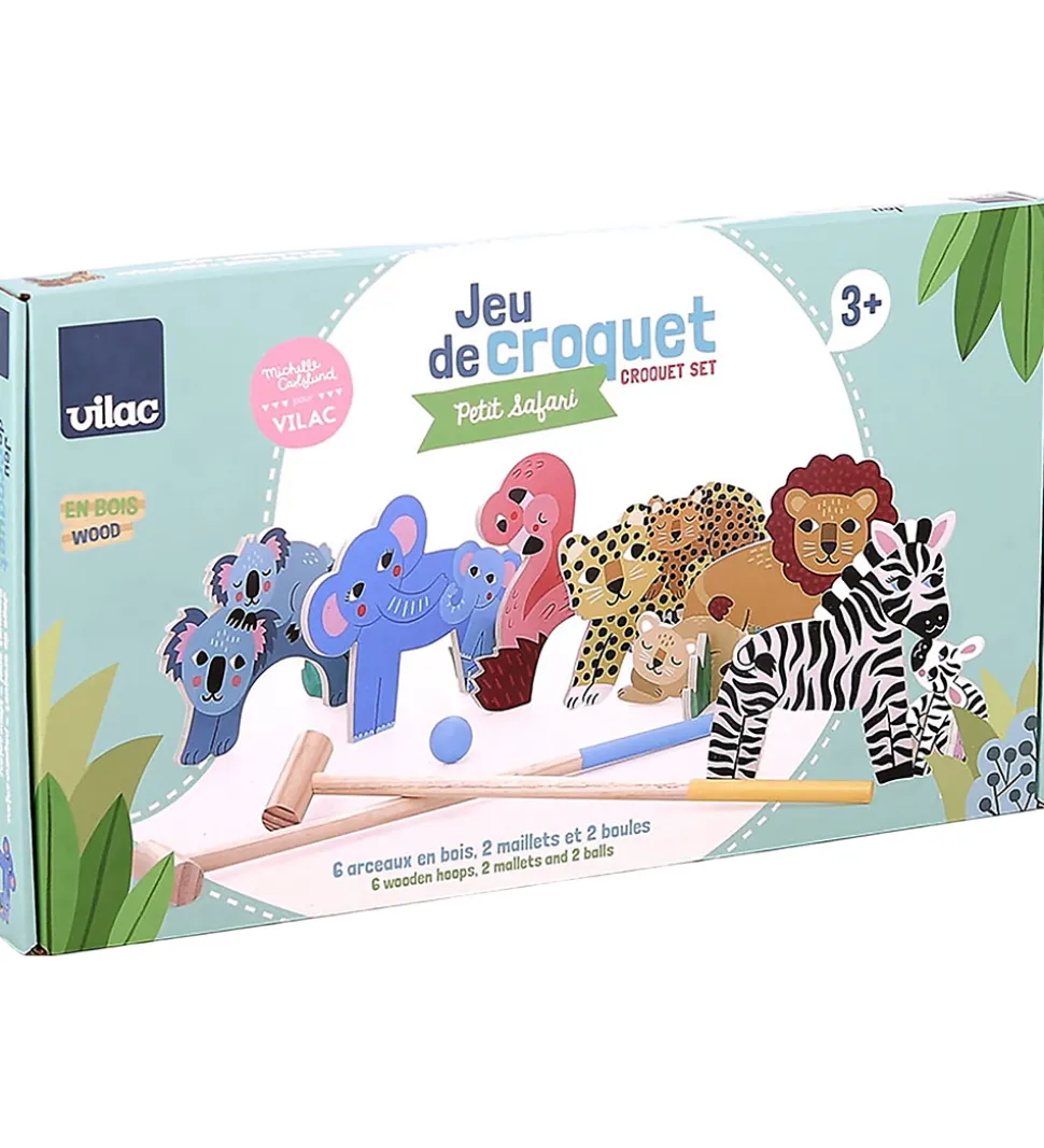 Fantastisk Vilac kroketsæt fremstillet i træ, bestående af en bane med 6 buer der forestiller forskellige safaridyr, to bolde og to køller med et farvet skaft i gul og lyseblå.