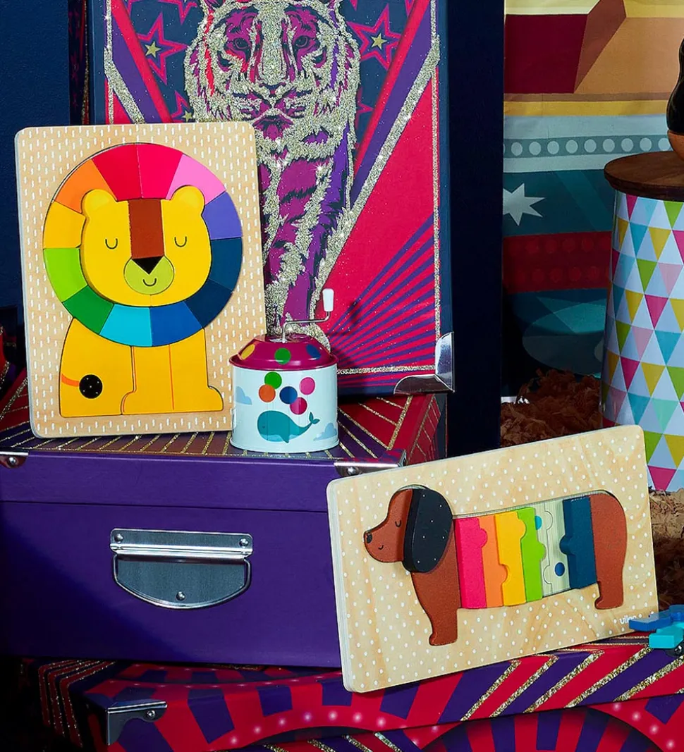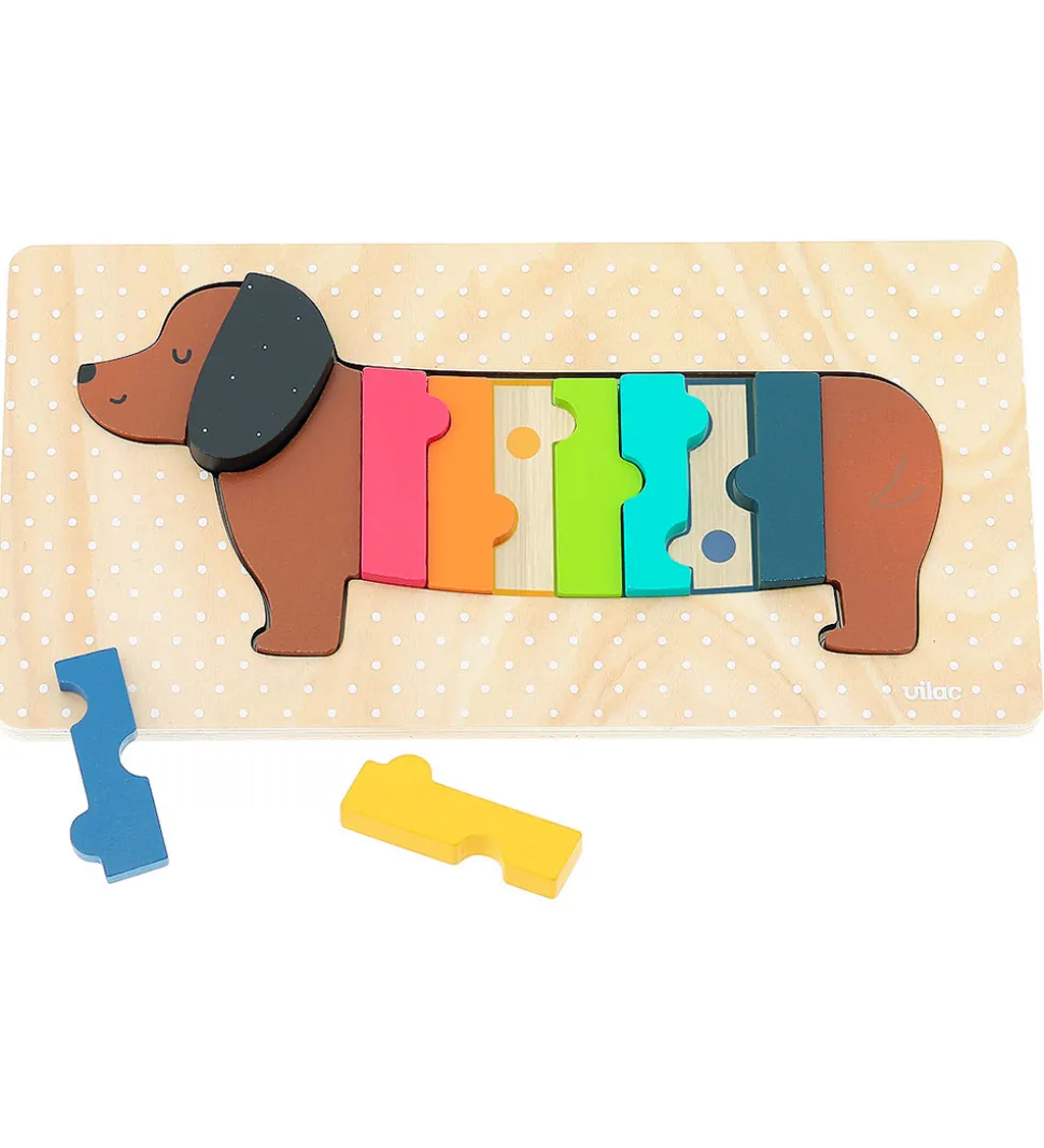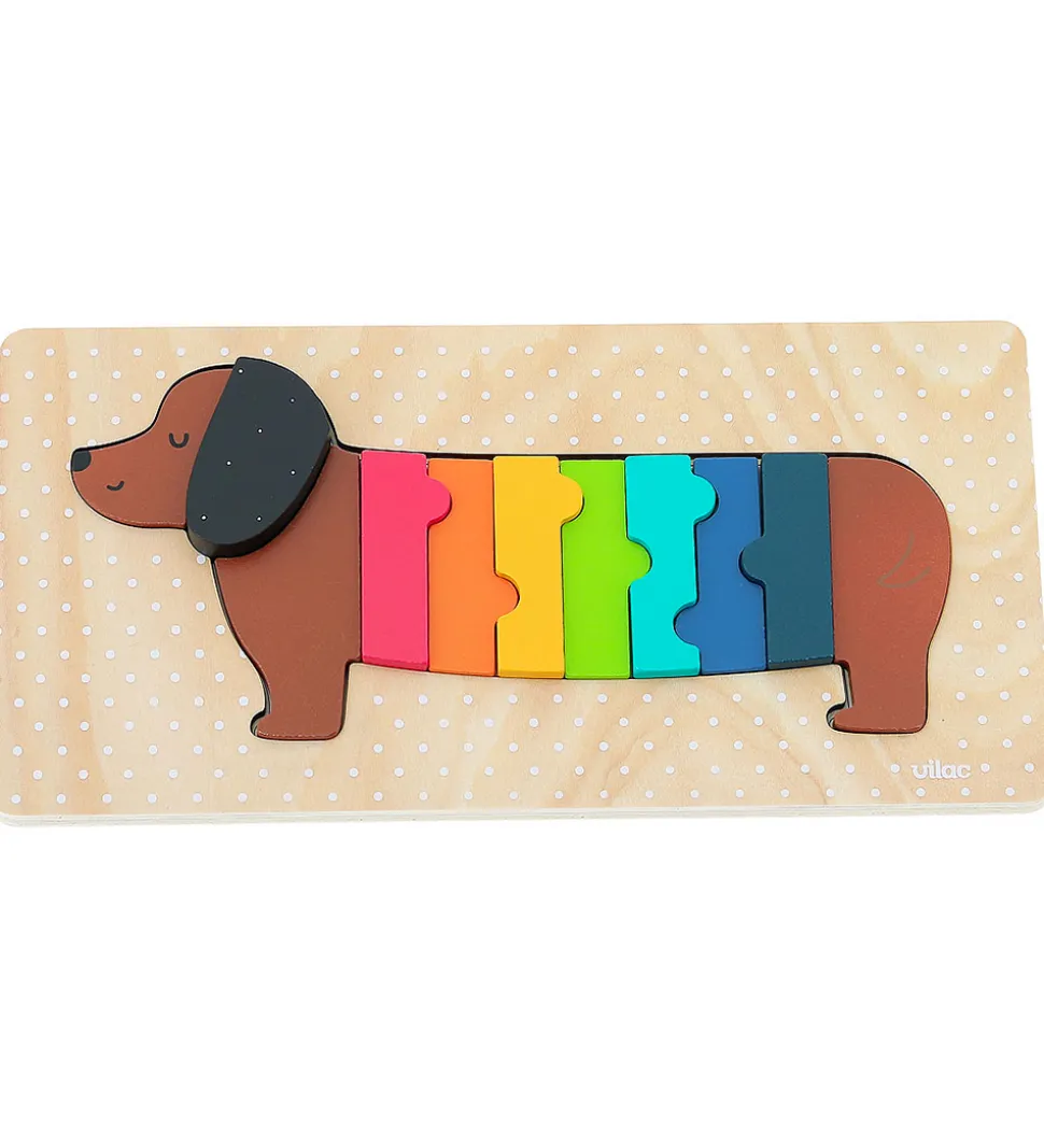 Sjovt Vilac puslespil, der forestiller en farverig gravhund, som samles i en plade.