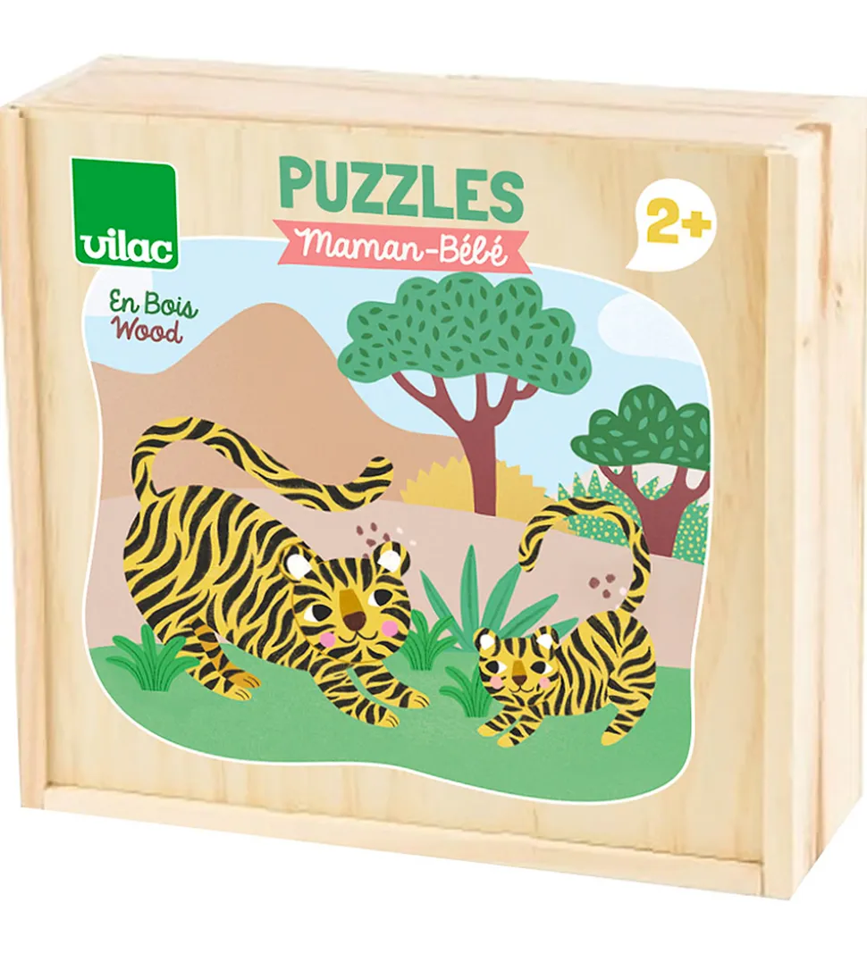 Sjovt Vilac puslespil, bestående af 12 separate, farverige puslespil á 2 brikker hver med motiv af en dyremor og -baby.