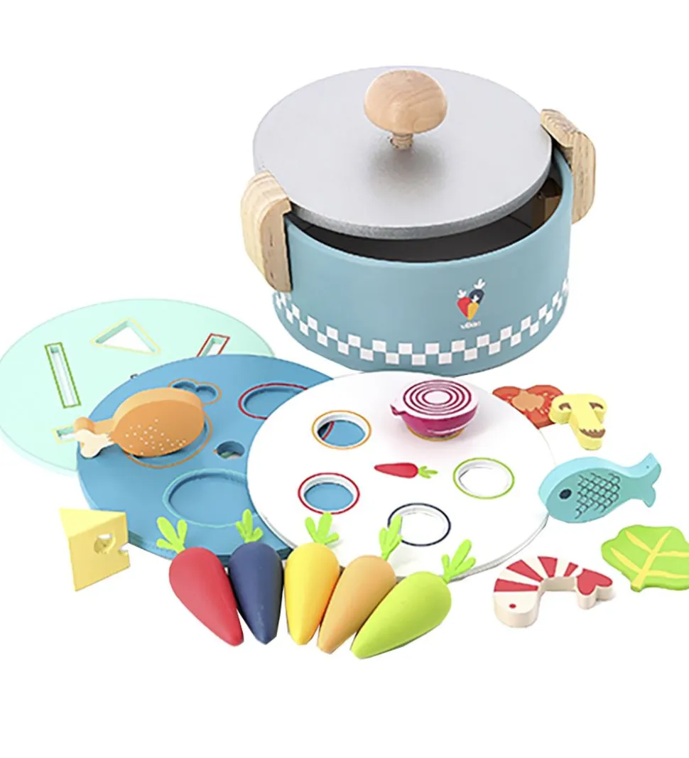 Lærerig Vilac puttekasse i træ, med form som en gryde med farverige ingredienser.