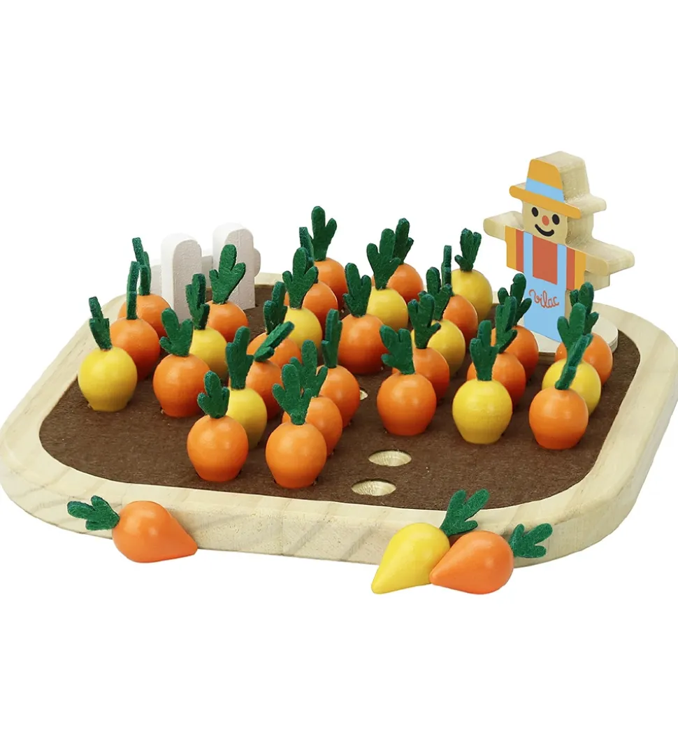 Vilac Gartnerens Grøntsager spil består af 33 dele og en træplade.